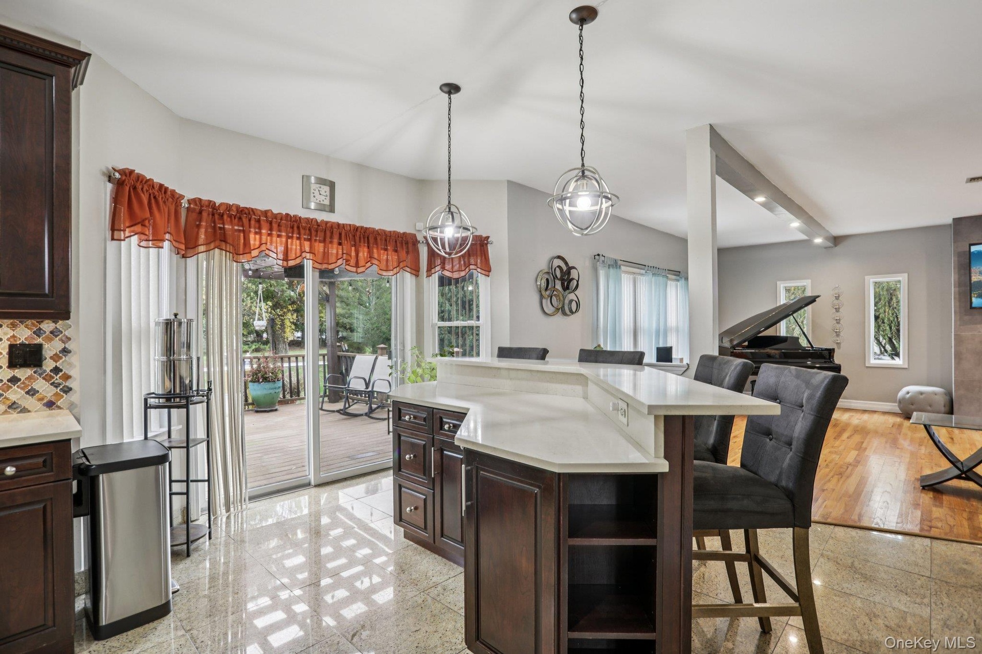 The oversized eat-in kitchen offers quartz countertops, upgraded stainless steel appliances, and a custom counter kitchenette area. Sliding glass doors lead to a professionally landscaped backyard with a Trex deck, creating a seamless indoor-outdoor living experience.