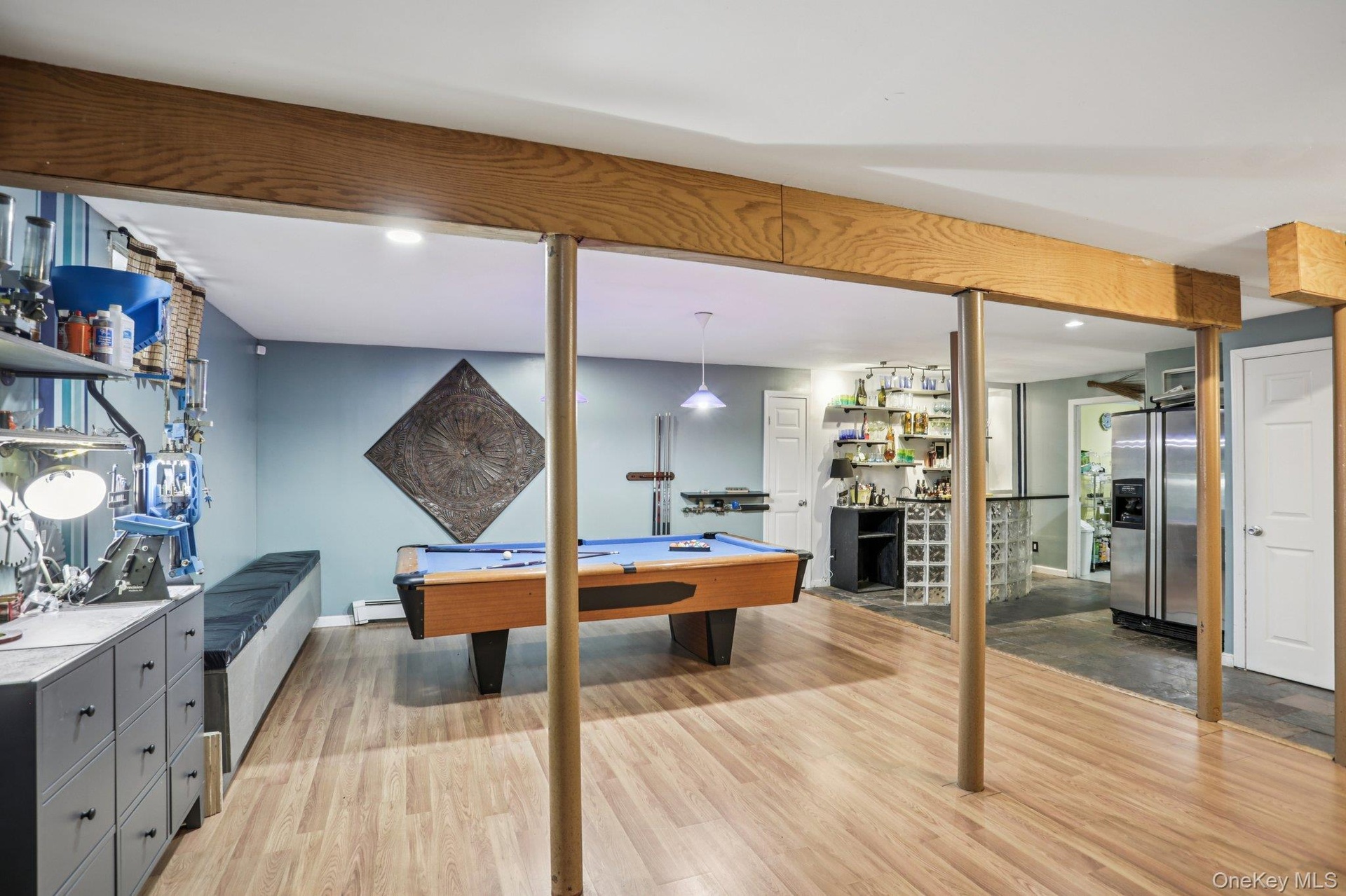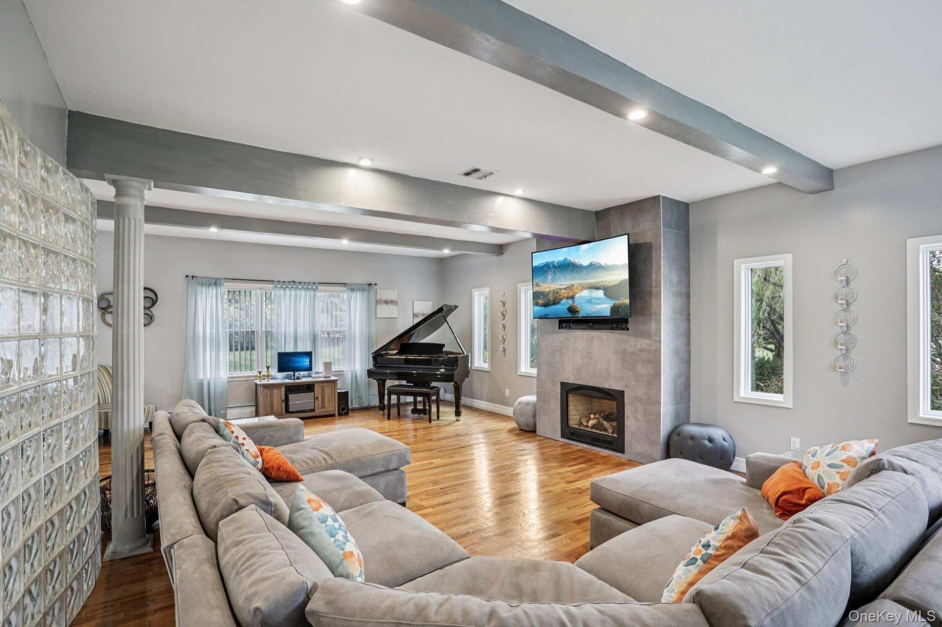- Expansive family room with hardwood floors and a cozy gas fireplace.