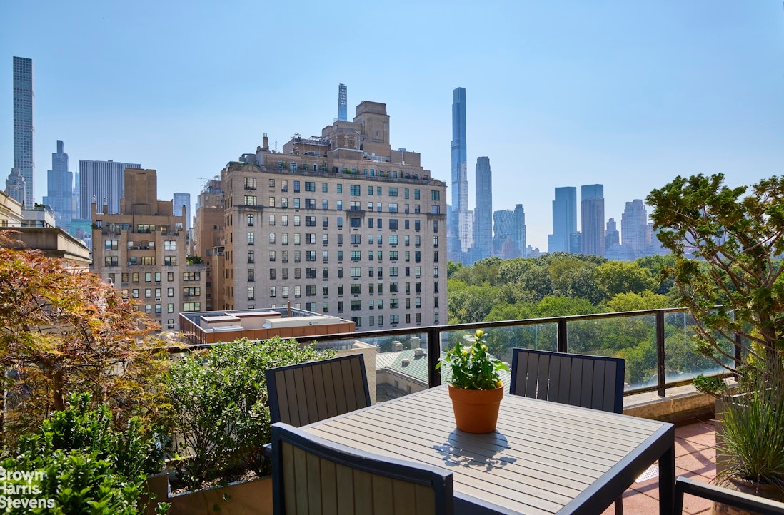 The fully irrigated terrace offers seating and dining areas with iconic city and park views. Additional highlights include automated lighting and shades, custom millwork throughout, excellent windows, and through-wall air conditioning.