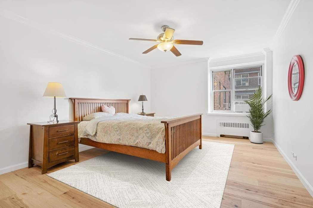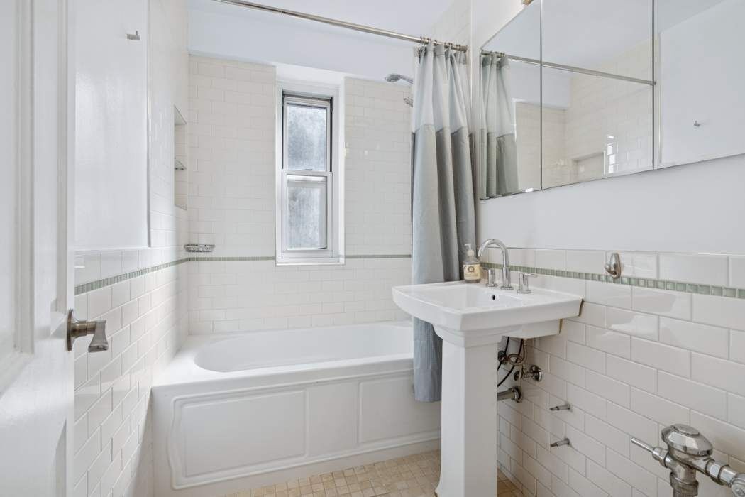The open, windowed kitchen features custom wood cabinetry, stainless steel appliances, and a sleek dining bar perfect for both cooking and entertaining. A gracious entry foyer with three closets enhances the sense of flow. The spacious primary bedroom includes two deep closets, while the well-proportioned second bedroom offers built-ins. The windowed bath has been tastefully updated with a soaking tub and pedestal sink.