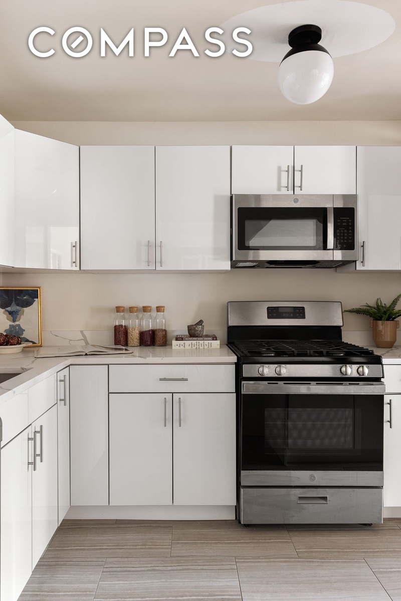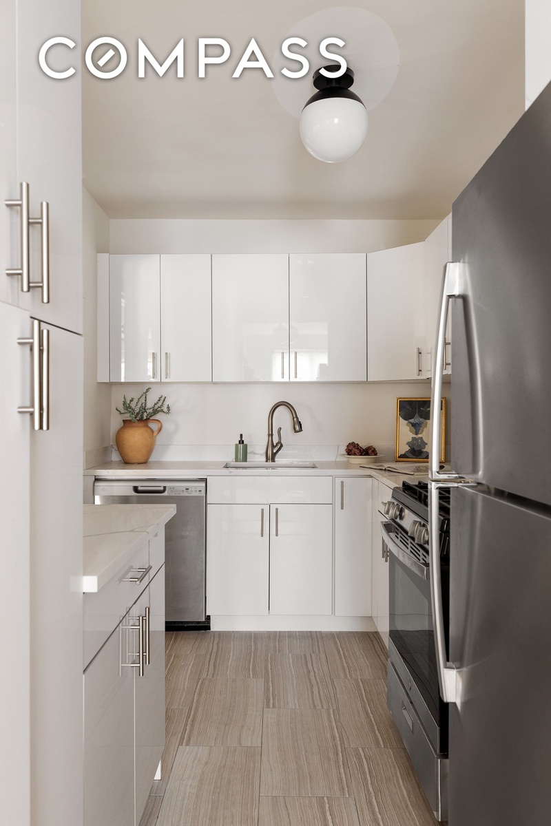 The sleek galley kitchen boasts European-style white acrylic cabinetry, Quartz Manhattan Calcutta countertops, and a full suite of stainless-steel appliances, including a microwave and dishwasher. Both bathrooms are elegantly finished with white Carrara marble tile.