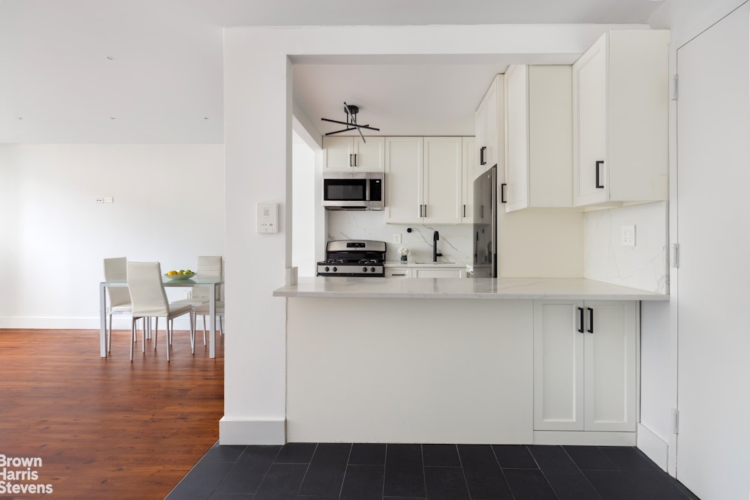 Beautiful and just renovated oversized kitchen with new Quartz counters and backsplash, Stainless appliances with new 2024 full size fridge, new dishwasher and microwave! Tons of beautiful custom cabinetry built to the ceiling and even hidden under the breakfast bar too! Brand new 2024 Bathroom with lovely porcelain stone tile, and beautiful farm sink feel with new hardware, new lighting and dual showerhead too. Best yet! Different than any other unit in Towers on the Park SMOOTH CEILINGS! (No popcorn here) Plus these owners love light! They have a wall of glass windows that runs entire length of the apt! Not everyone spends the time, energy and money to have all this glass. Enjoy the natural light West to the quiet tree lined street and north to your F line special bonus-- A side park view of trees from your very own apt! Residence #4F has the lowest Common charges in a condominium this size with this light and in a full service established building. Only $565 a month and no assessments.