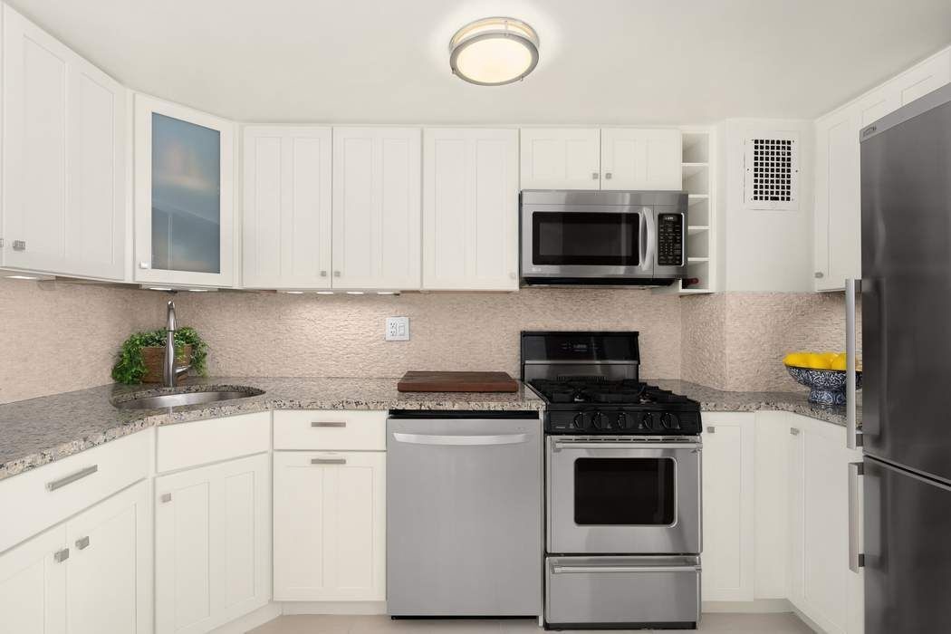 Upon entry, a charming mini foyer with an oversized coat closet leads to a sleek, curved-wall kitchen. Designed for both beauty and function, the kitchen features white shaker cabinetry, gray granite countertops, and top-of-the-line stainless steel appliances—perfect for casual meals or shared cooking experiences with friends and family.