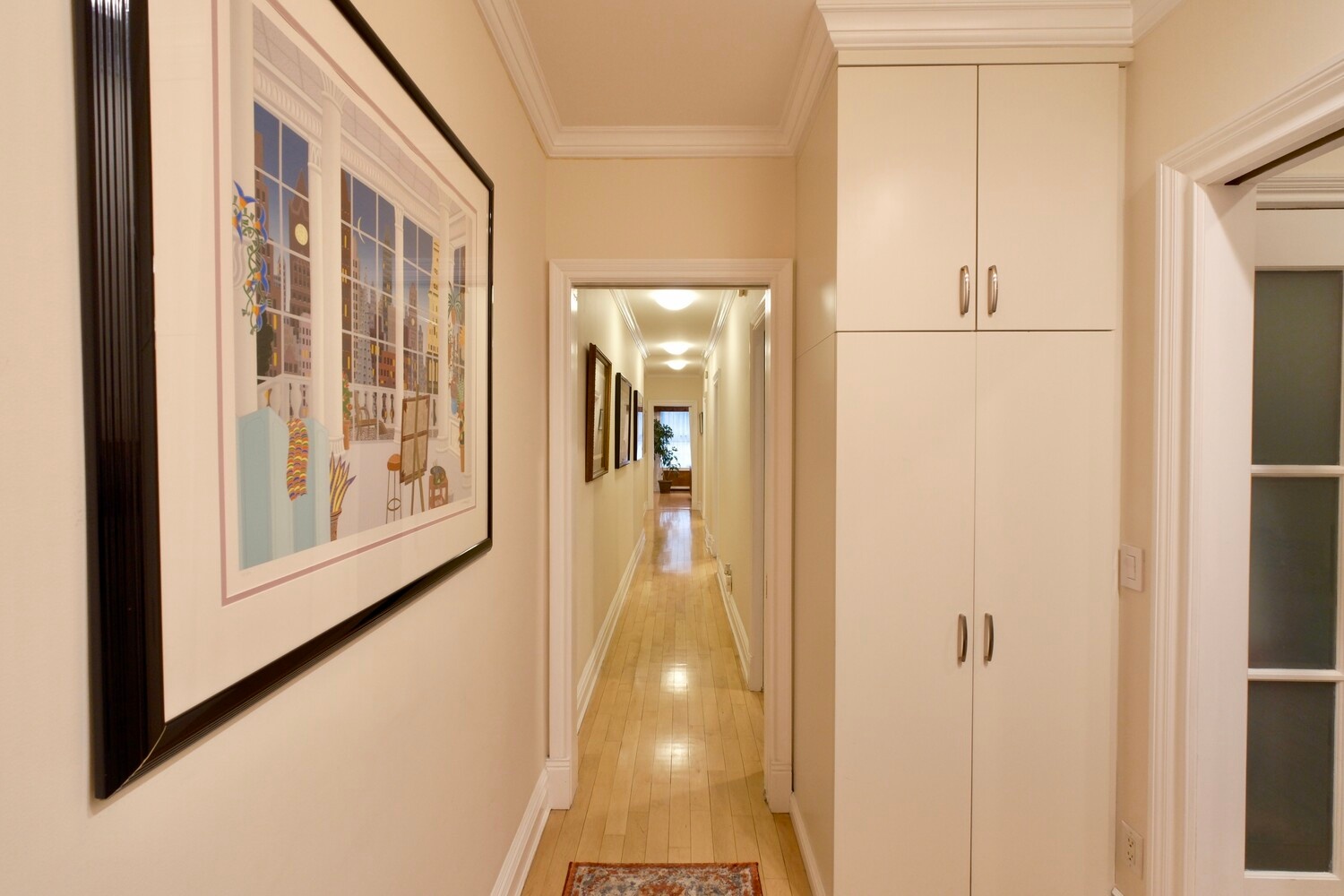 Residents are greeted by a welcoming foyer with a built-in wardrobe. Directly off the foyer is a large bedroom that can be used as a home office-with a pair of deep reach-in closets. A long hallway leads to formal living and dining rooms separated by double pocket doors.