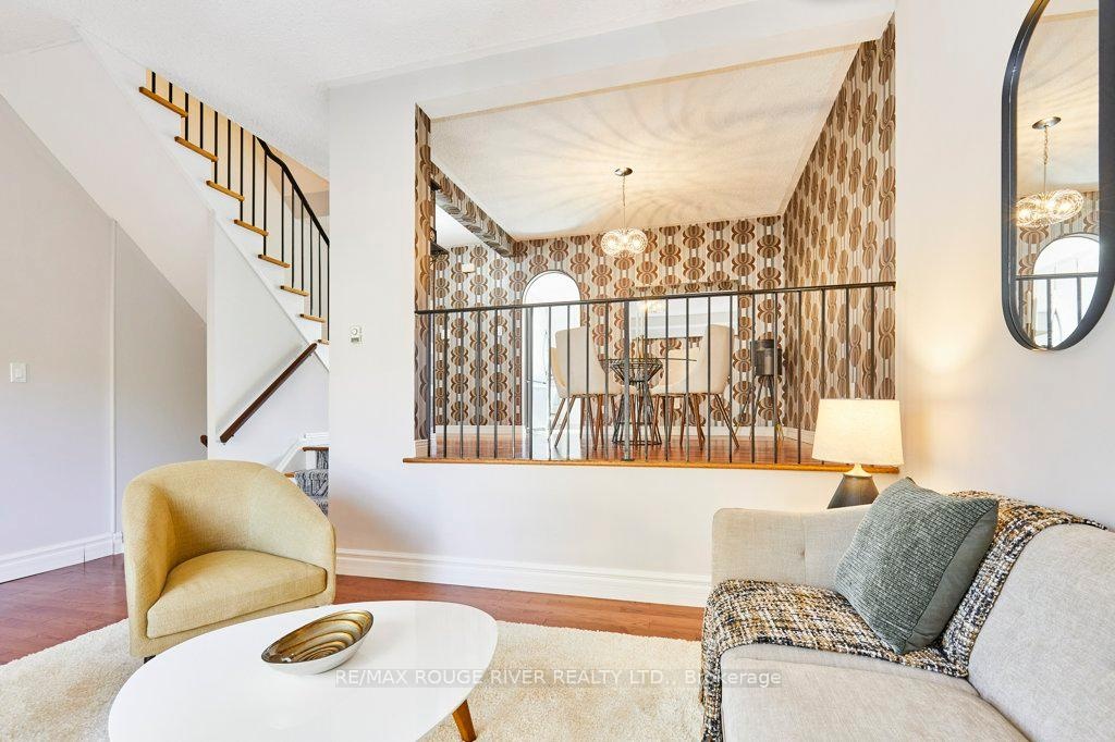 Very affordable starter in a wonderful, family-oriented neighbourhood. Well-maintained, freshly painted and updated, the home features three spacious bedrooms with ample closet space. Huge living room with vaulted ceilings and walk-out to the patio and private, fully- fenced yard. Dining room adjacent the kitchen overlooks the living room, giving the entire main floor an open, airy and light-filled space. Kitchen includes plenty of cabinets, stainless steel appliances, double sink, built-in dishwasher, microwave oven and ceramic tile backsplash. Main bathroom was updated with a full size walk-in shower with chrome & glass door from Bath Fitter; and a beautiful ceramic floor. Hardwood floors throughout most of the house; the principal room floors feature gleaming oak planks. Stair treads are also hardwood and the main stairways have been enhanced with new premium runners. The lower level/basement includes a bright, cozy rec room with fresh new broadloom. Windows, patio door and front door all replaced in 2015. The location is ideal: minutes to the waterfront and other great parks; adjacent popular Mowat pool; amazing transit with TTC on the doorstep and Port Union GO just down the road; Port Union Rec Centre; library, shopping, great schools and much more!