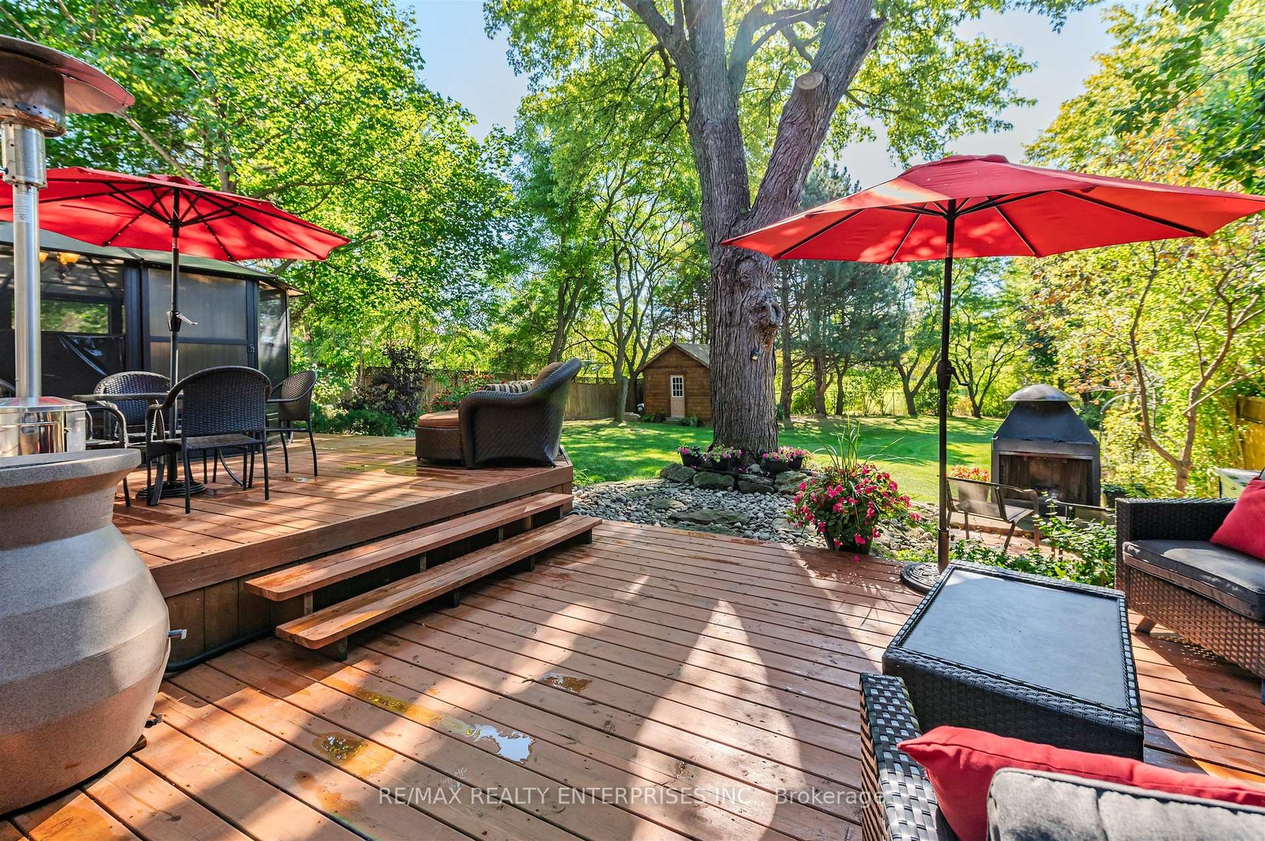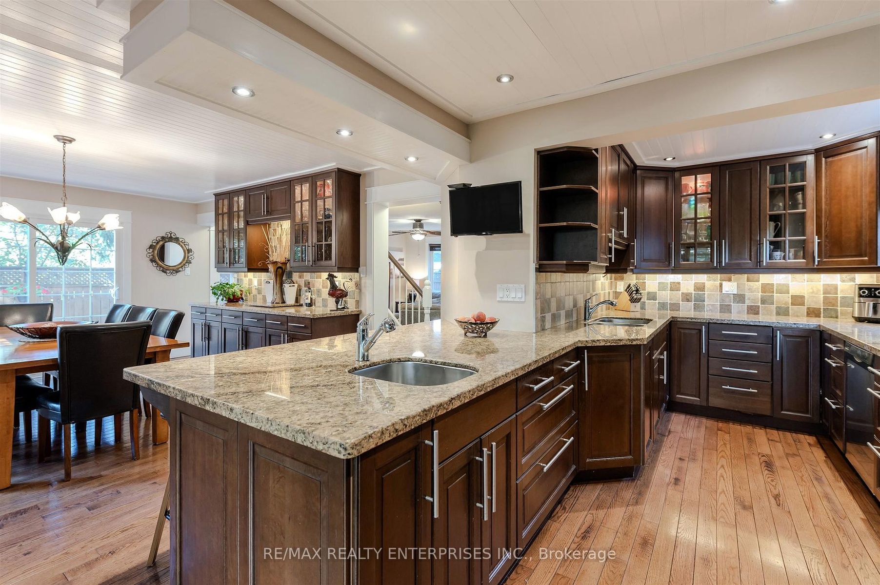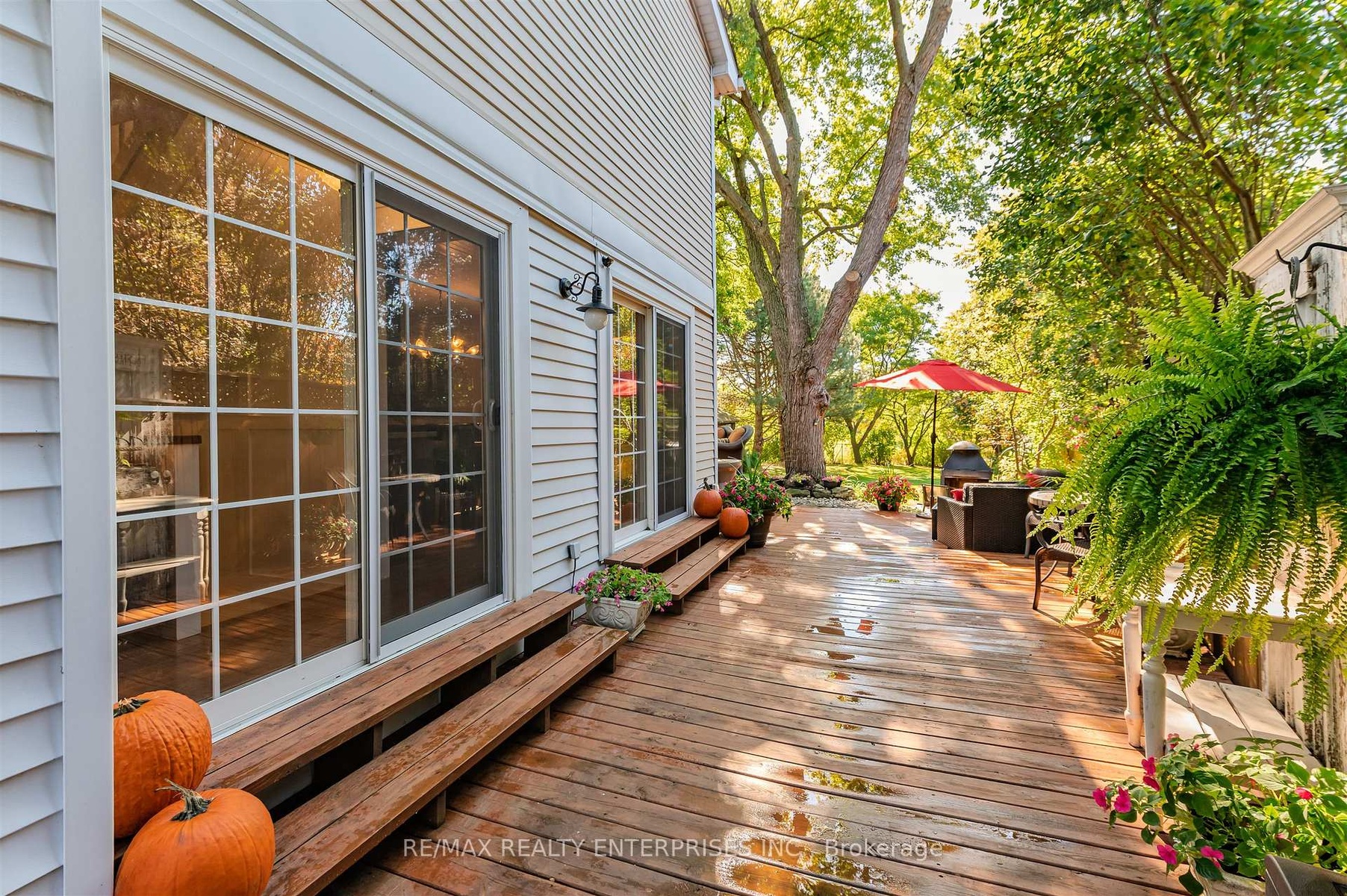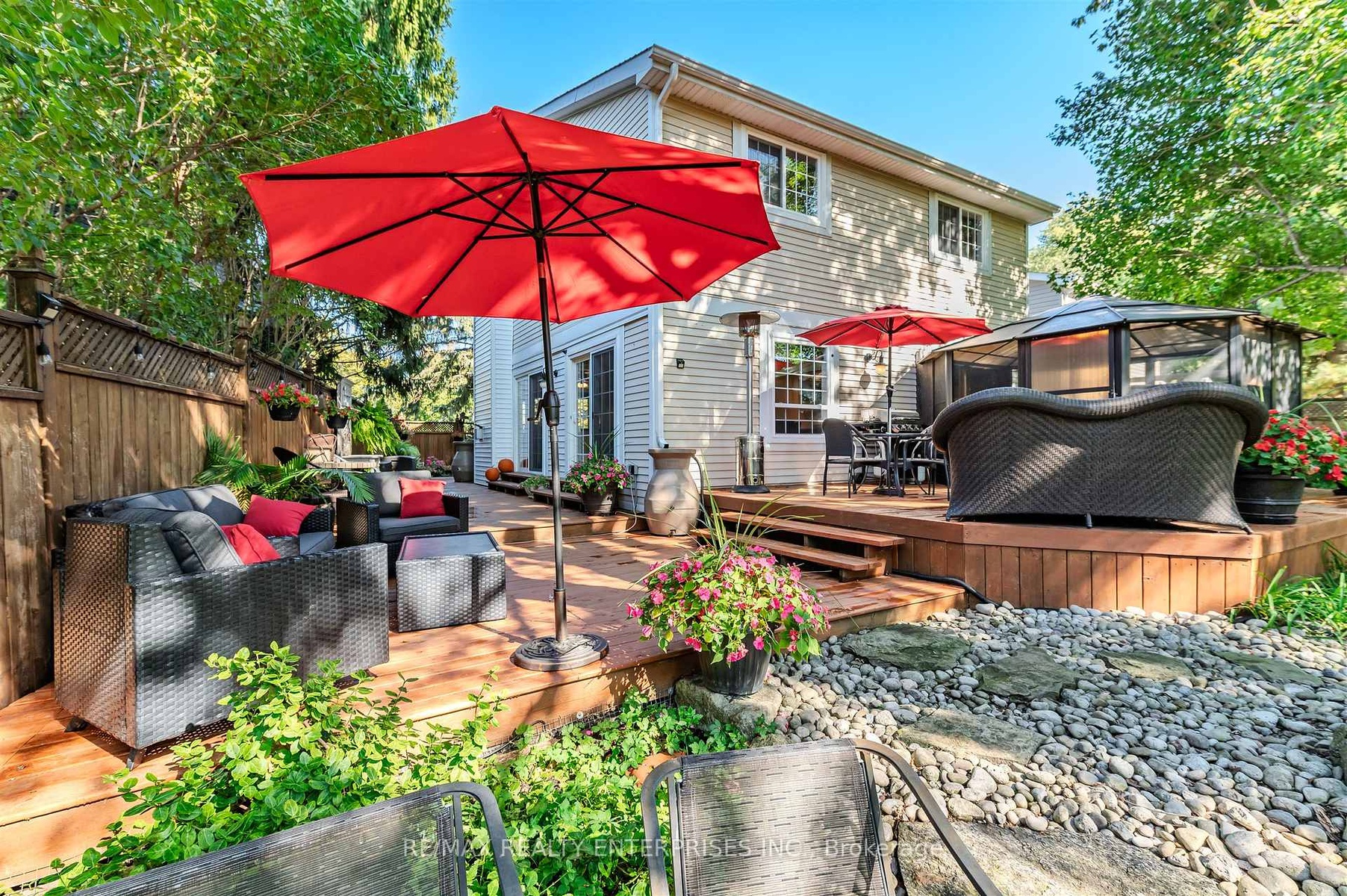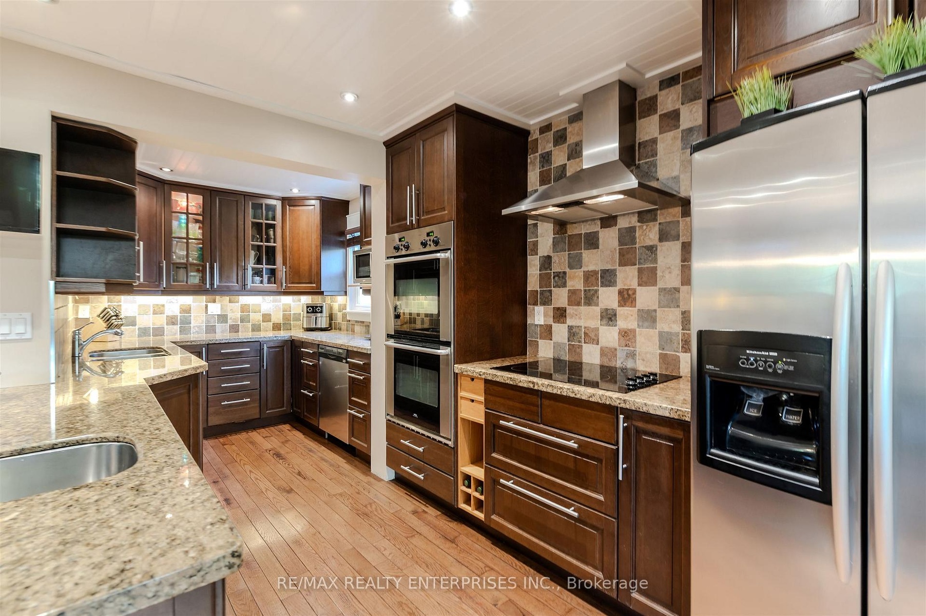 Introducing 18 Blueridge Square, a meticulously renovated three-bedroom residence on an oversized, nearly half-acre private lot backing onto the Etobicoke Creek Trail in one of Bramptons most sought-after, family-friendly neighbourhoods. This bright, open-concept home features a modern kitchen with extensive cabinetry, granite countertops, stainless steel appliances including a built-in double oven, a double sink, and a large island with a prep sinkideal for cooking and entertaining. Adjacent is an enclosed gazebo, perfect for year-round outdoor dining. The living room boasts a gas fireplace and separate walkouts from the living and dining areas lead to a continuous deck starting at the front courtyard, wrapping around the side and extending to a spacious rear deck, creating seamless indoor-outdoor living. The main floor laundry room includes built-in cabinetry for ample storage. Upstairs, find three spacious bedrooms including a primary suite with an electric fireplace, a dressing room with built-in cabinetry, and a tastefully renovated semi-ensuite bathroom with a jetted tub and skylight. The fully finished basement offers a large recreation room, a stylish wet bar, a full bathroom, and flexible space for a home office, gym, or guest suite. The professionally landscaped, expansive private yard is enhanced by in-ground sprinklers, mature trees, and a custom oversized cedar shed, forming a tranquil backyard oasis with direct access to the Etobicoke Creek Trail and a private gate to Somerset Public School ideal for families. Additional features include an attached garage, upgraded flooring, and beautifully maintained front and rear yards, all on a quiet crescent close to parks, transit, shopping, and more. This exceptional turnkey home blends modern comfort, thoughtful upgrades, generous outdoor living, and everyday convenience.