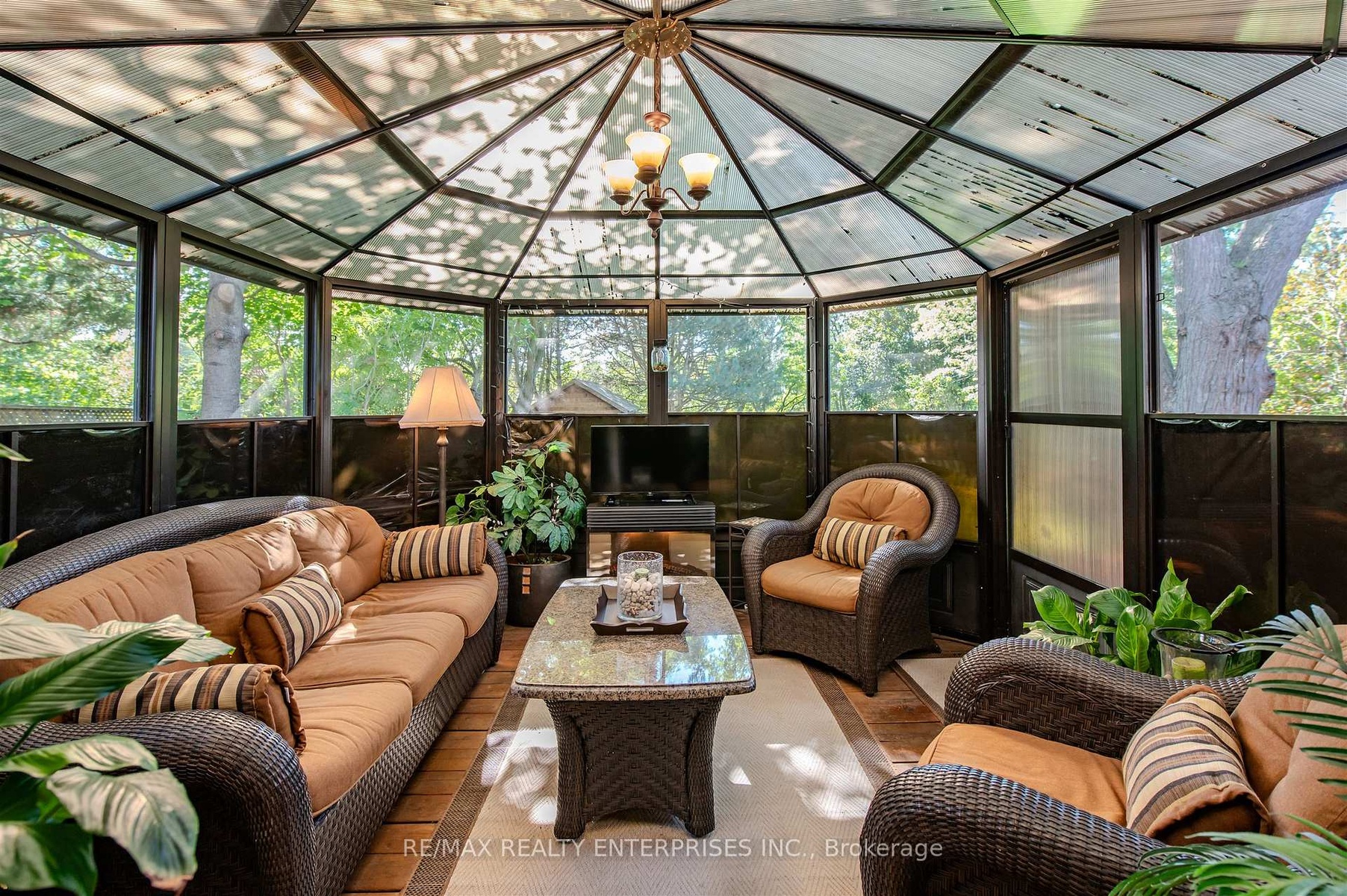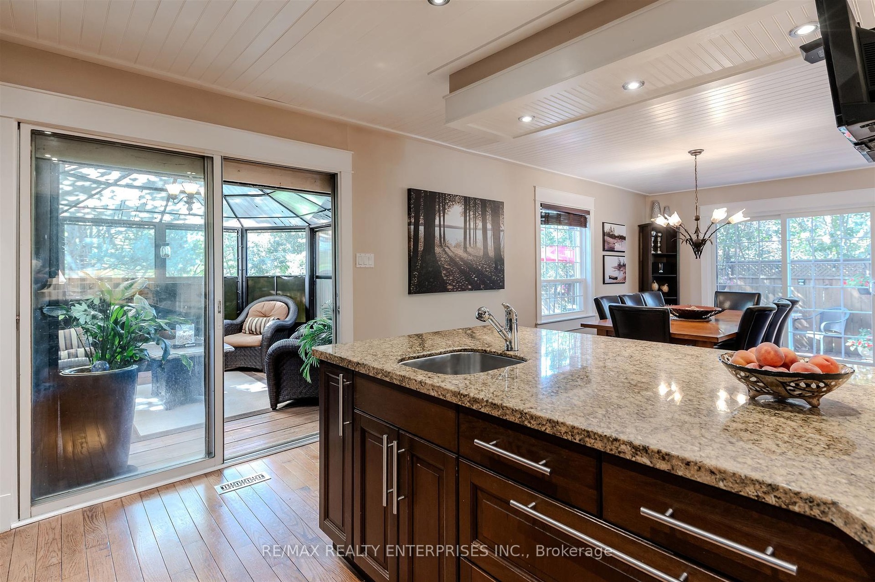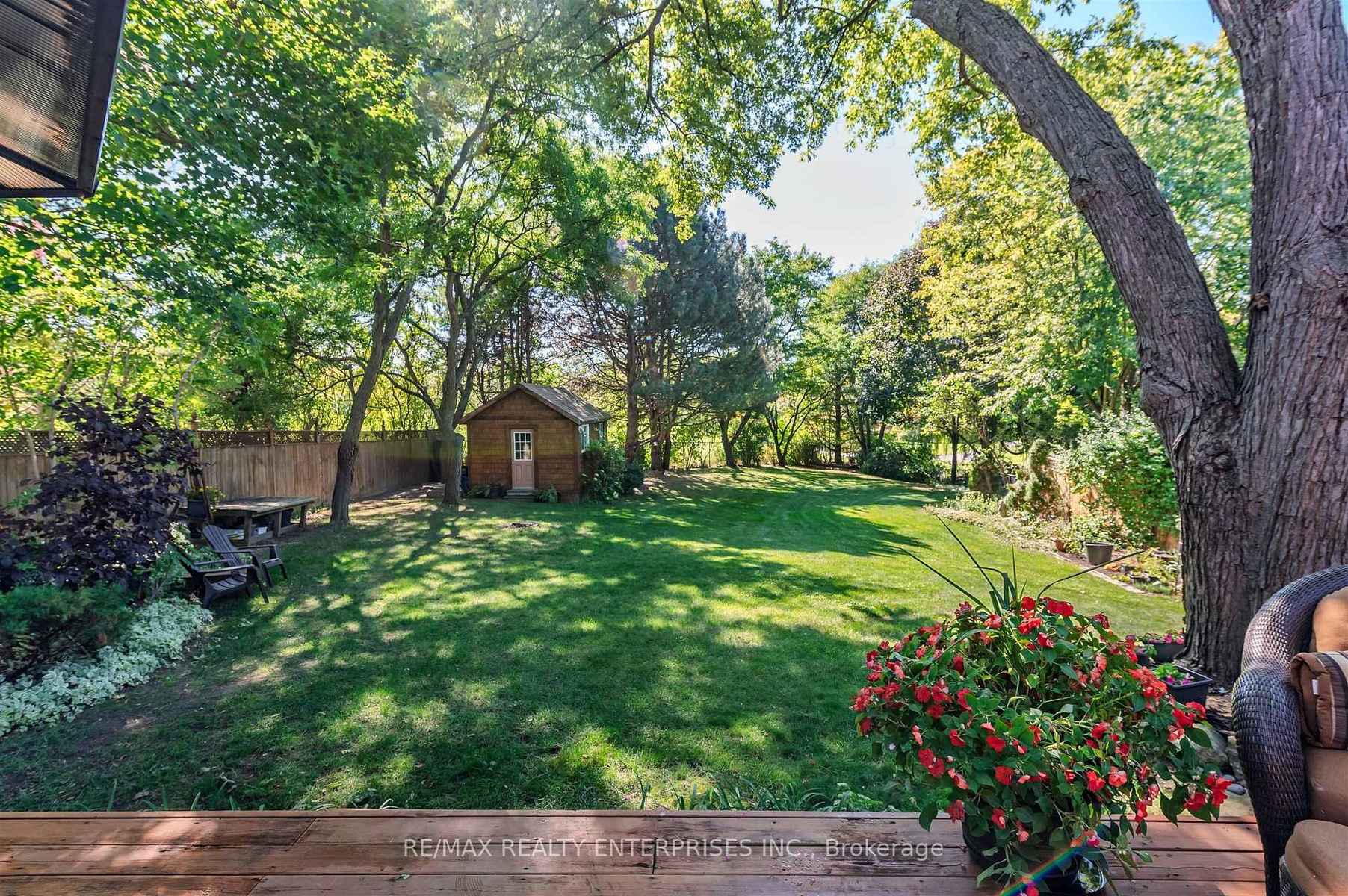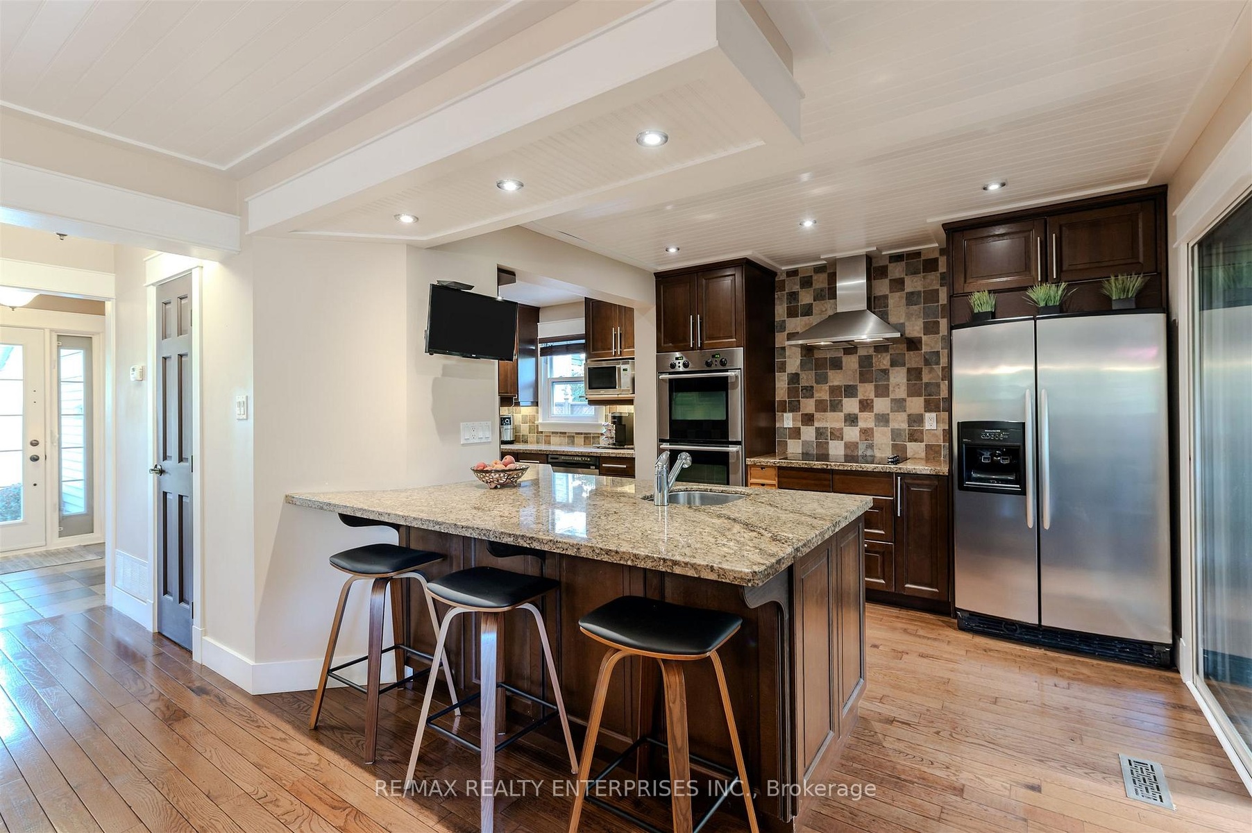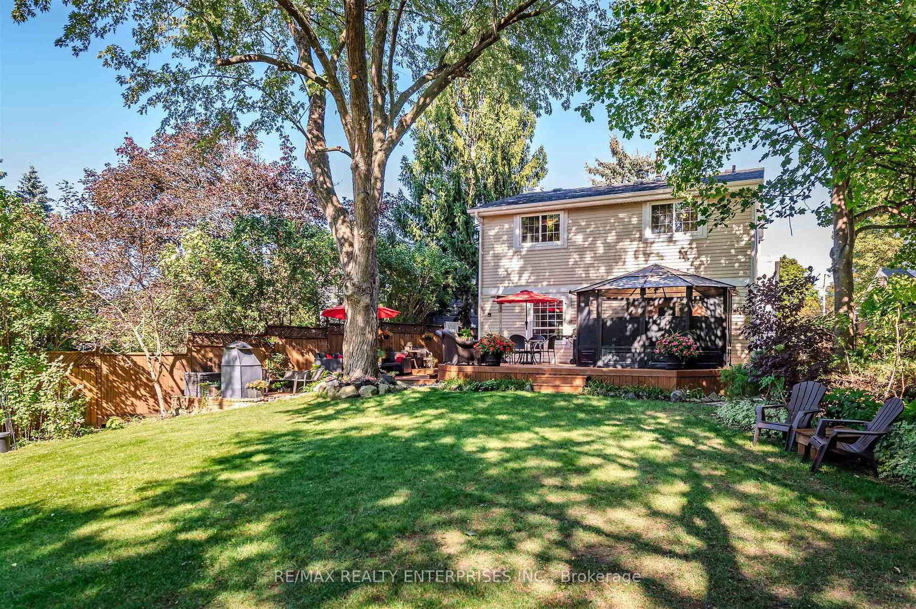 Introducing 18 Blueridge Square, a meticulously renovated three-bedroom residence on an oversized, nearly half-acre private lot backing onto the Etobicoke Creek Trail in one of Bramptons most sought-after, family-friendly neighbourhoods. This bright, open-concept home features a modern kitchen with extensive cabinetry, granite countertops, stainless steel appliances including a built-in double oven, a double sink, and a large island with a prep sinkideal for cooking and entertaining. Adjacent is an enclosed gazebo, perfect for year-round outdoor dining. The living room boasts a gas fireplace and separate walkouts from the living and dining areas lead to a continuous deck starting at the front courtyard, wrapping around the side and extending to a spacious rear deck, creating seamless indoor-outdoor living. The main floor laundry room includes built-in cabinetry for ample storage. Upstairs, find three spacious bedrooms including a primary suite with an electric fireplace, a dressing room with built-in cabinetry, and a tastefully renovated semi-ensuite bathroom with a jetted tub and skylight. The fully finished basement offers a large recreation room, a stylish wet bar, a full bathroom, and flexible space for a home office, gym, or guest suite. The professionally landscaped, expansive private yard is enhanced by in-ground sprinklers, mature trees, and a custom oversized cedar shed, forming a tranquil backyard oasis with direct access to the Etobicoke Creek Trail and a private gate to Somerset Public School ideal for families. Additional features include an attached garage, upgraded flooring, and beautifully maintained front and rear yards, all on a quiet crescent close to parks, transit, shopping, and more. This exceptional turnkey home blends modern comfort, thoughtful upgrades, generous outdoor living, and everyday convenience.