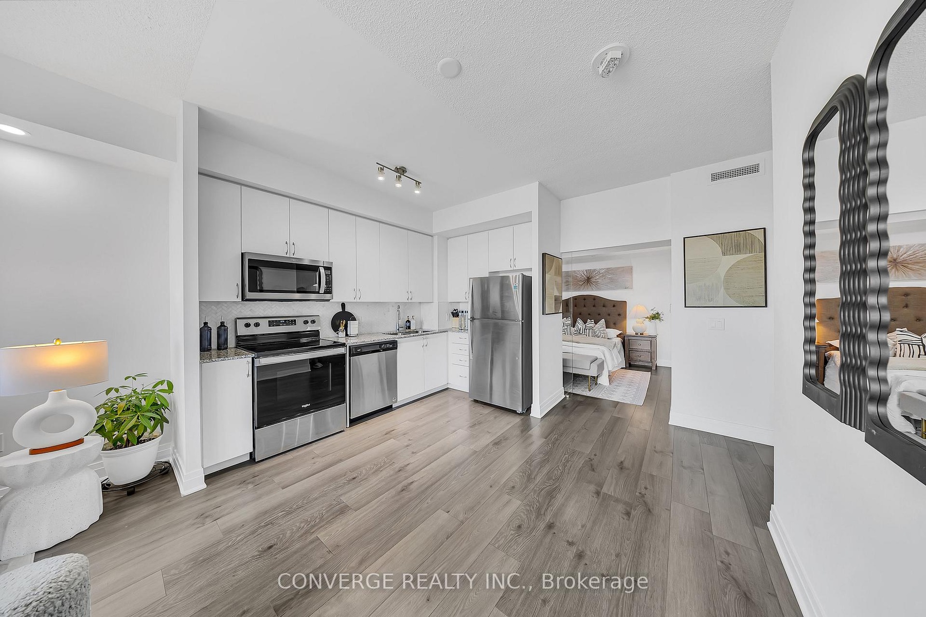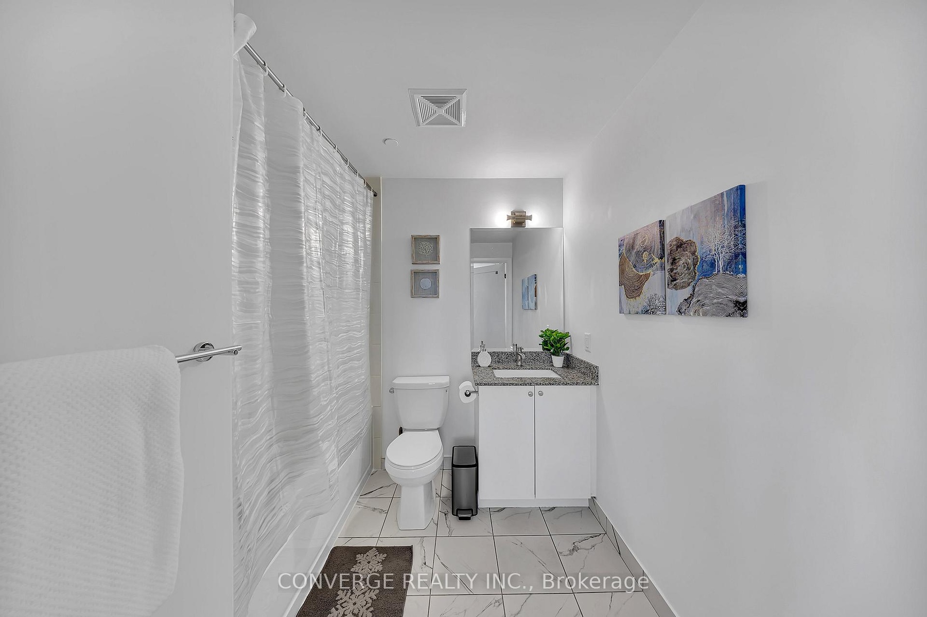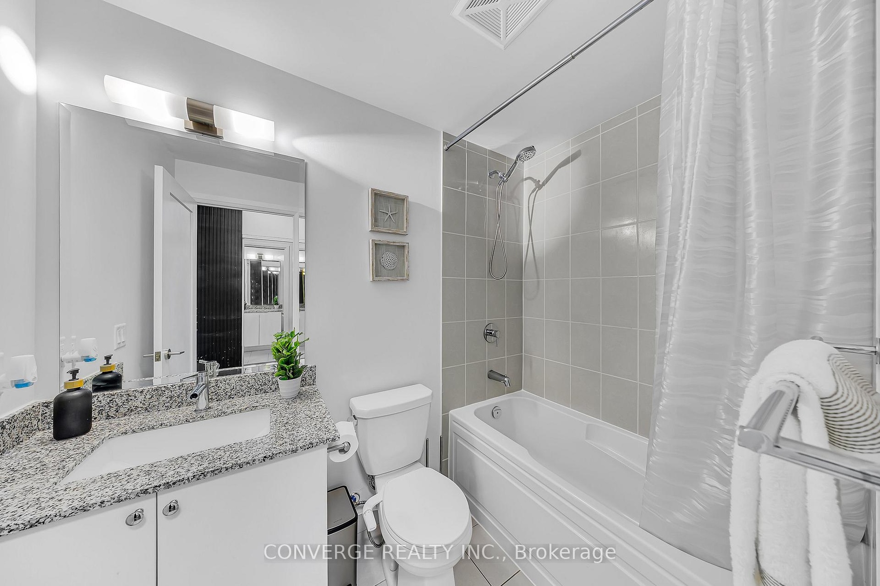 TOTAL 944 SQ. Welcome to this stunning 2-bedroom, 2-bathroom condo, ideally situated in the centre of Toronto. This beautifully upgraded end unit features expansive floor-to-ceiling windows that bathe the space in natural light, while offering unobstructed views of the Toronto skyline. The living room is enhanced by pot lights and remote motorized blinds, allowing you to adjust the ambiance. The open-concept living and dining area is ideal for both entertaining and relaxing. All Ceiling upgraded light fixtures allows you to change the lighting to one of three colours. The full-size kitchen is designed for both function and style, with ample counter space and storage. Step outside onto your private balcony, which spans over 115 square feet and is laid with lush turf grass. The space is complemented by garden lights along the edges, creating a cozy, inviting outdoor oasis where you can enjoy breathtaking views of the city skyline and sunsets. The building offers exceptional convenience with a TTC bus stop right at your doorstep, less than 3 minutes to the 401, 404, and DVP. For added comfort, the building has a 24-hour concierge service. This unit has access to the buildings EV parking, making it ideal for modern living. 1 parking space and 2 lockers.