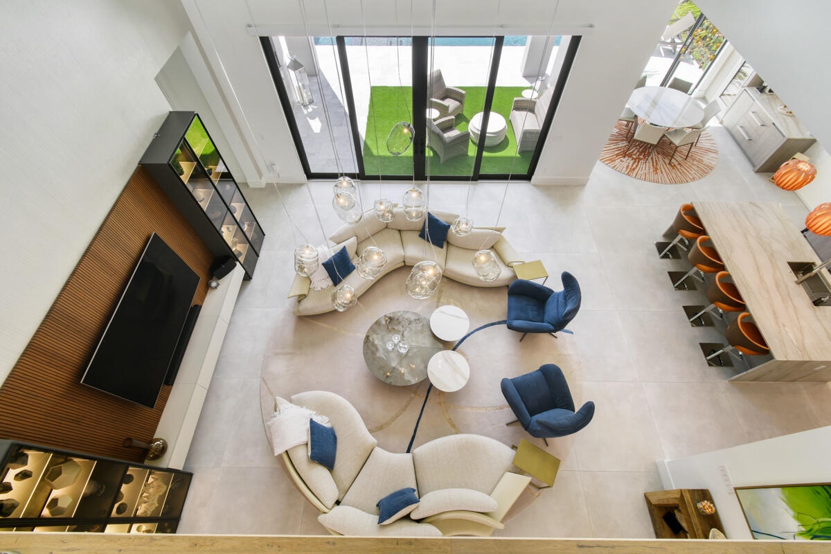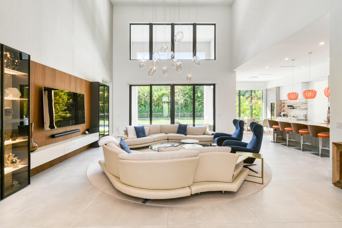 Step into elegance the moment you arrive at 18432 Symphony Court, where luxury and design meet in perfect harmony. This stunning Jupiter estate is the epitome of refined living, meticulously crafted with upscale finishes and timeless sophistication.From the grand entryway, you're greeted by imported designer chandeliers from Italy, suspended gracefully from soaring 25-foot ceilings. These radiant centerpieces illuminate a custom, backlit Italian wall unit with floating shelves, set against a stunning silk wallpaper backdrop, offering a dramatic yet elegant welcome.The open-concept layout is anchored by ravishing 48'' x 48'' porcelain tile flooring that flows throughout the main level.