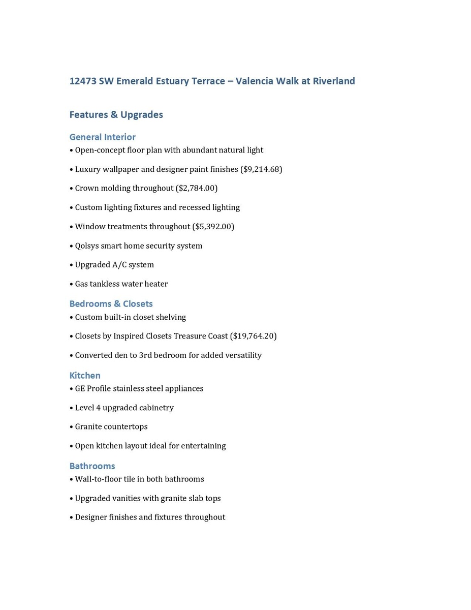 DescriptionExperience luxury living at its finest in this meticulously upgraded 3-bedroom, 2-bathroom home located in the prestigious Valencia Walk at Riverland community. Every inch of this residence showcases elegance, craftsmanship, and thoughtful design. Step inside to an open floor plan enhanced by luxury wallpaper, designer paint, and custom lighting fixtures that create a warm, inviting atmosphere. The crown molding adds timeless sophistication throughout, while Closets by Inspired Closets Treasure Coast and built-in custom shelving maximize organization and style.