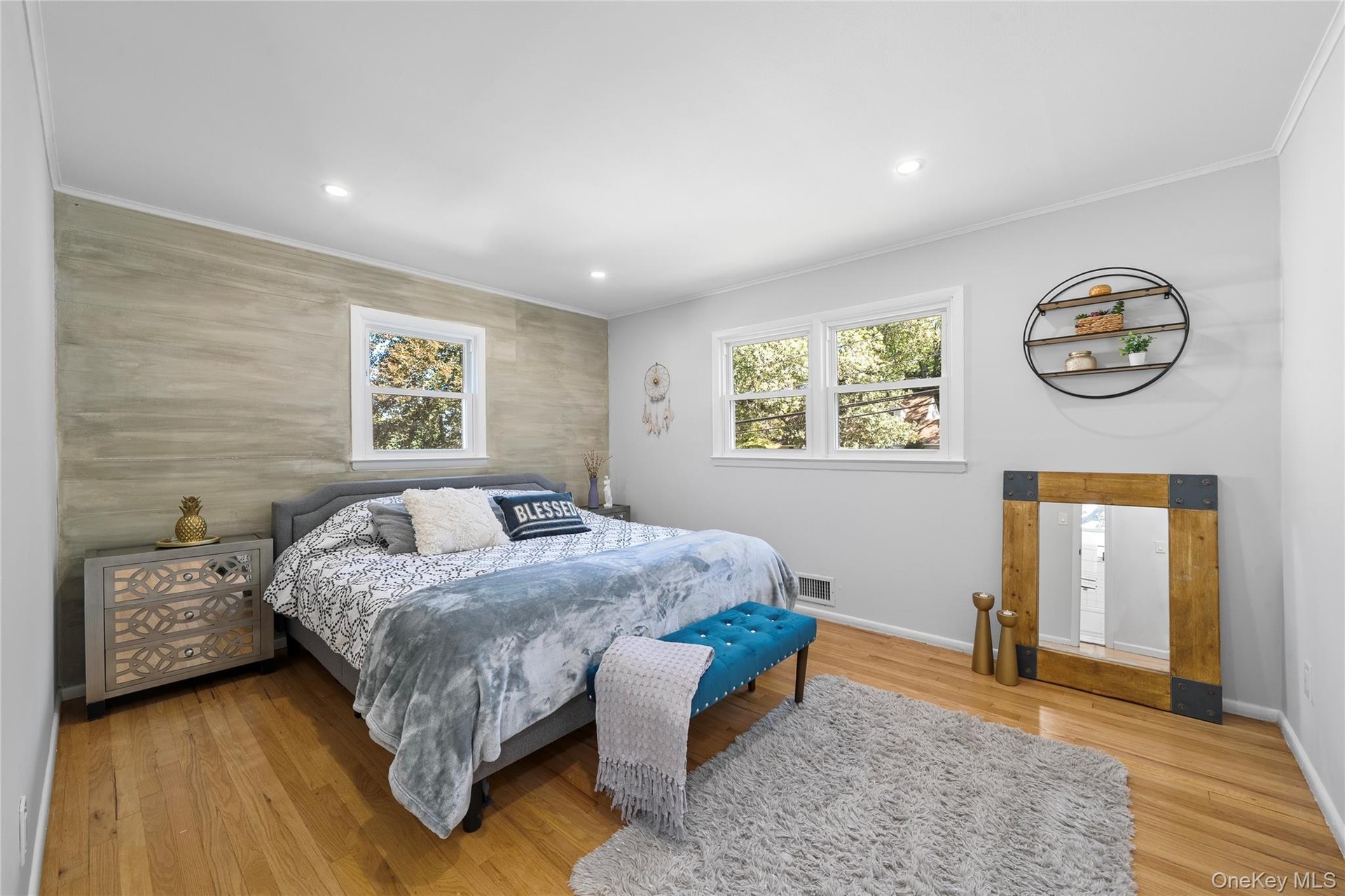 - Bedroom featuring light wood finished floors, ornamental molding, and recessed lighting