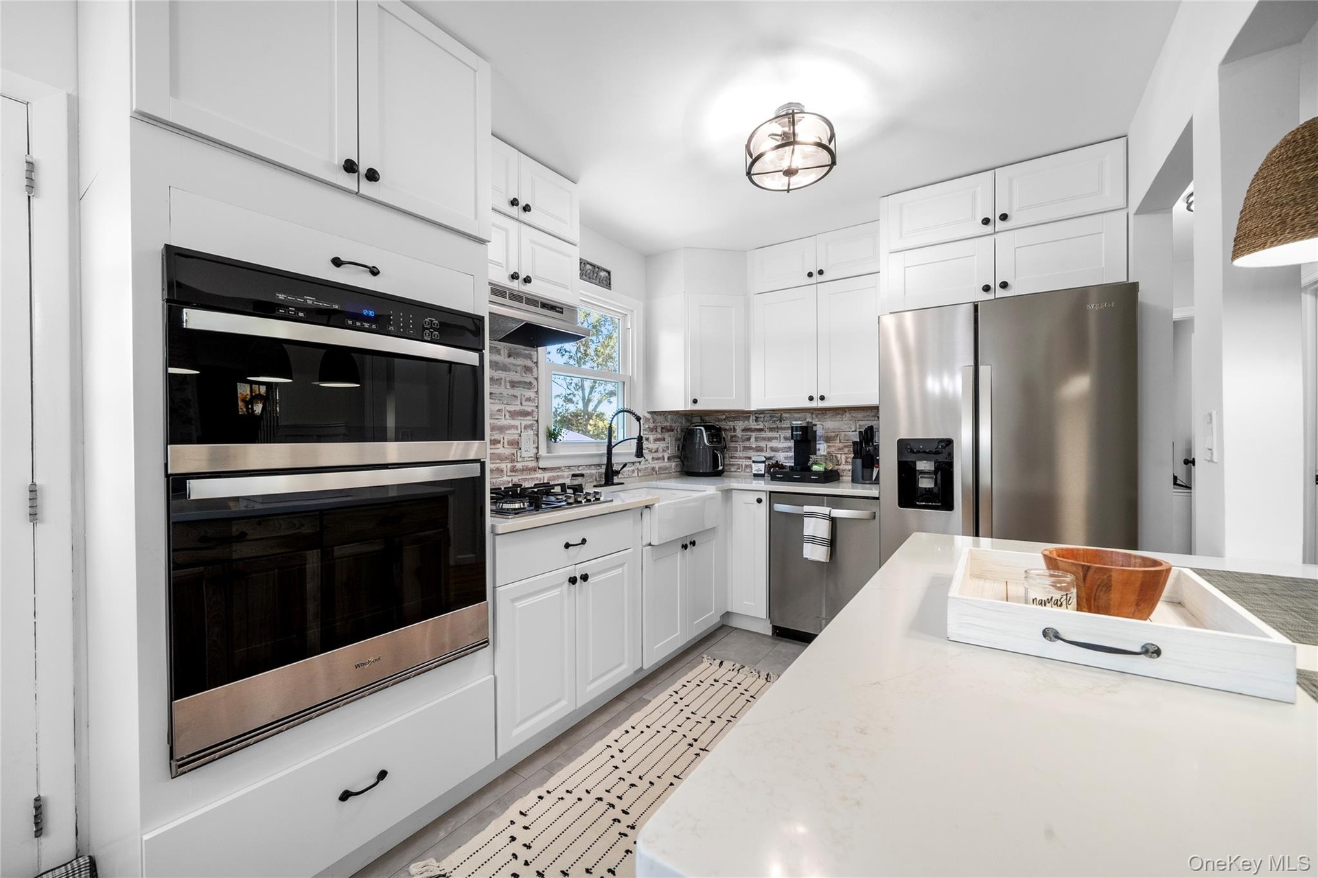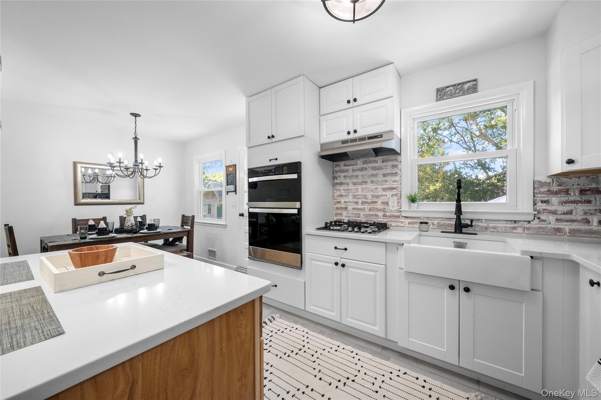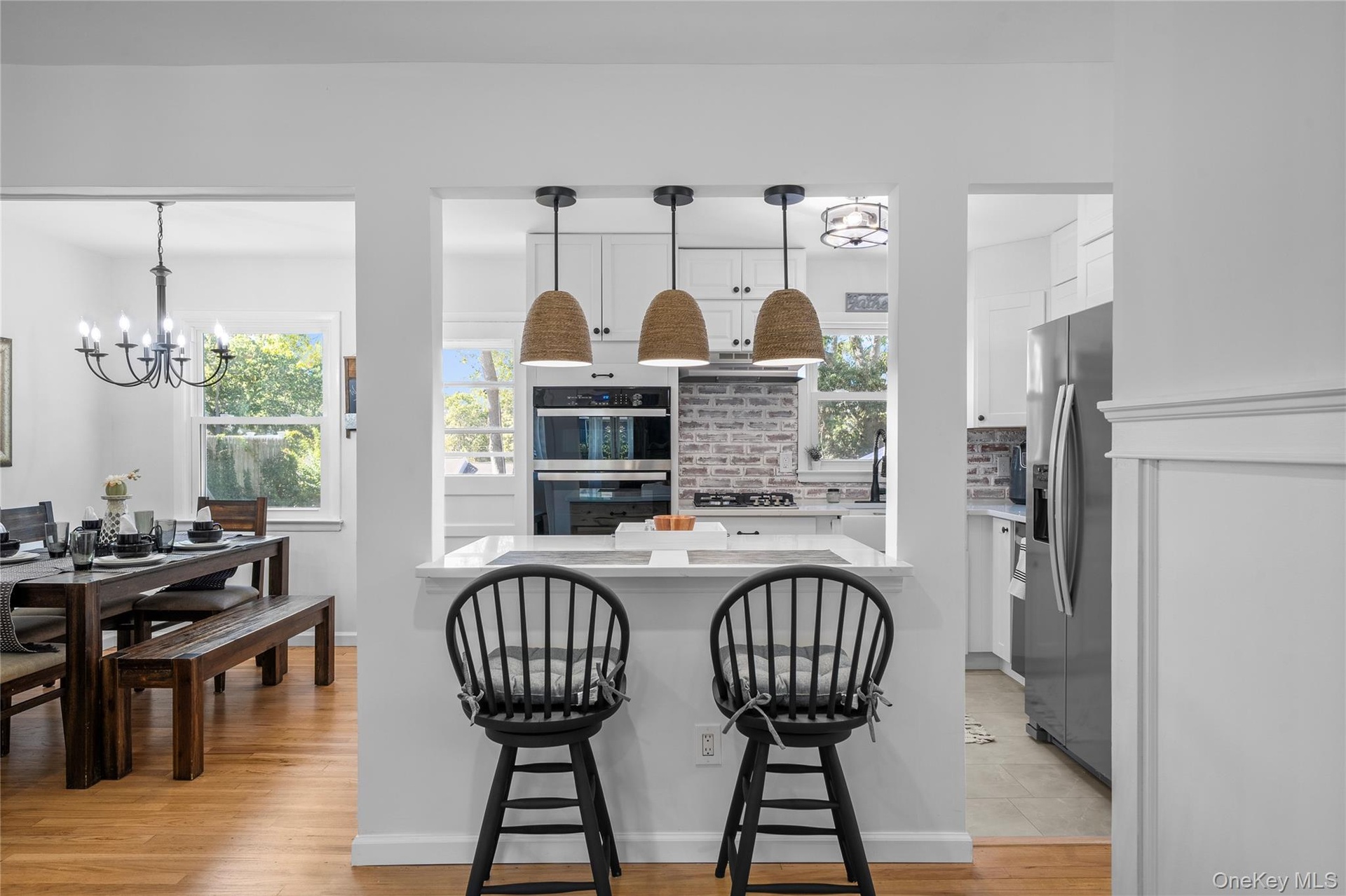 - Kitchen with white cabinets, a breakfast bar area, hanging light fixtures, and backsplash