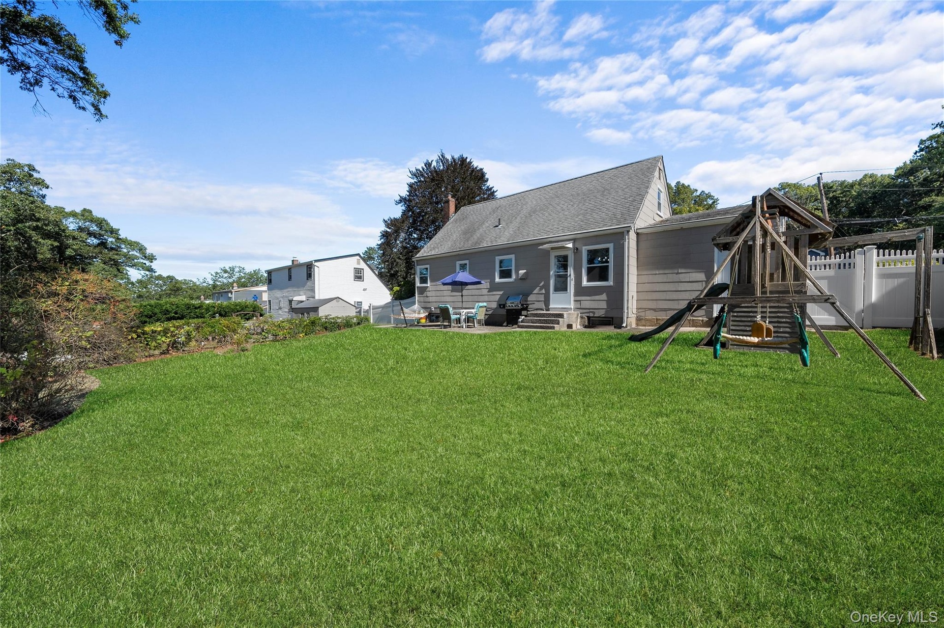 - Fenced backyard featuring a patio area