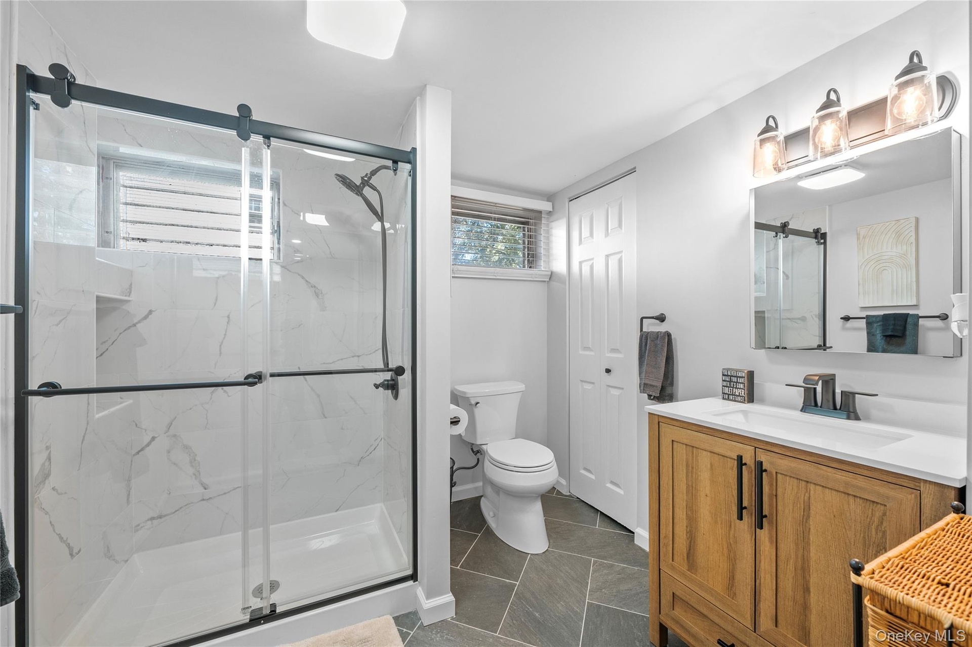 - Full bath featuring vanity, a marble finish shower, and dark tile patterned flooring