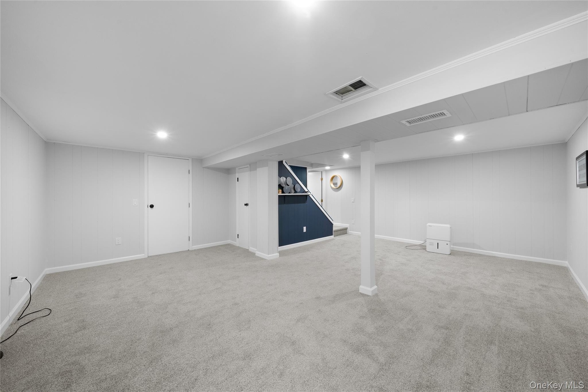 - Finished below grade area with light colored carpet, crown molding, wooden walls, and recessed lighting