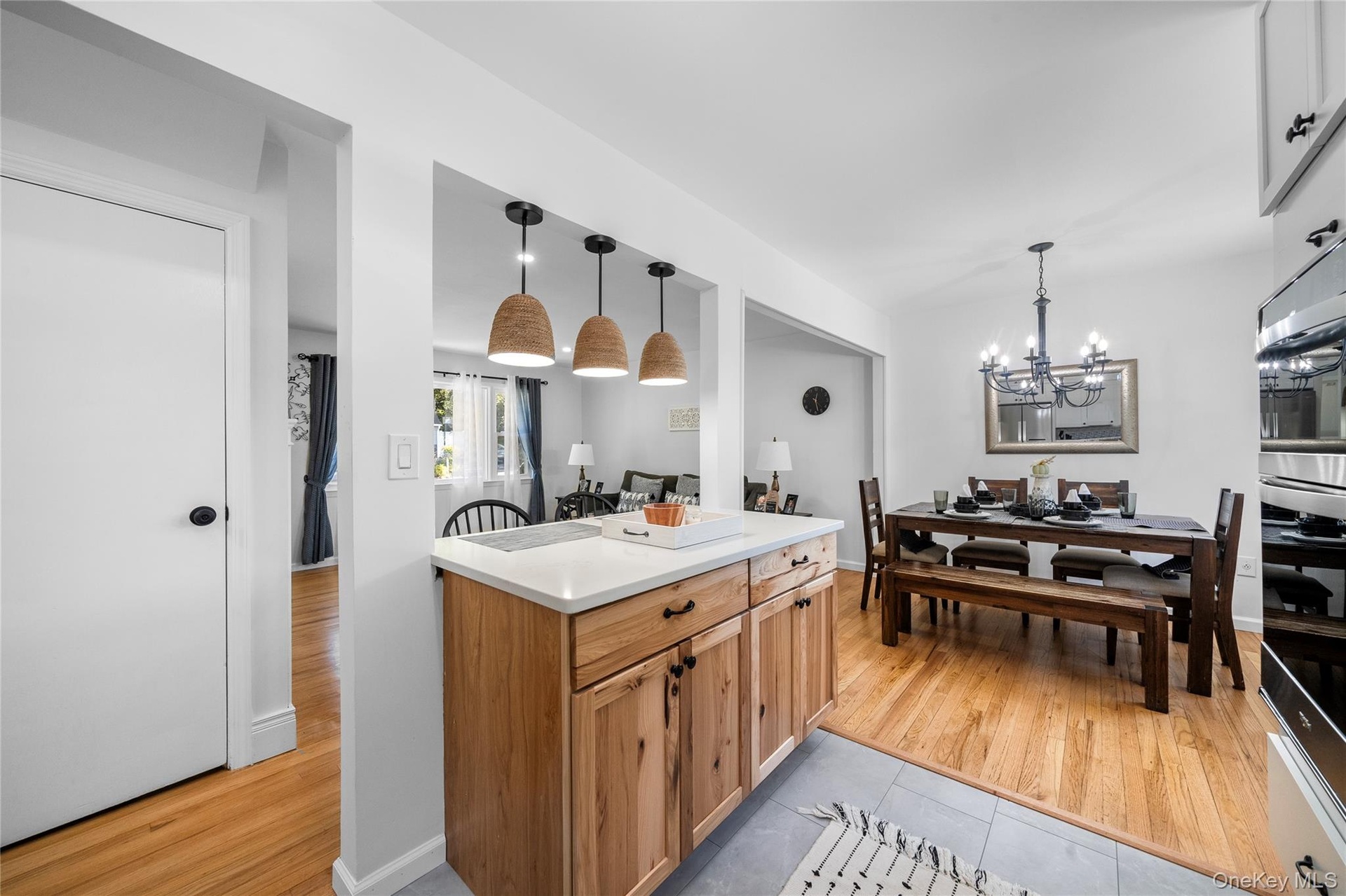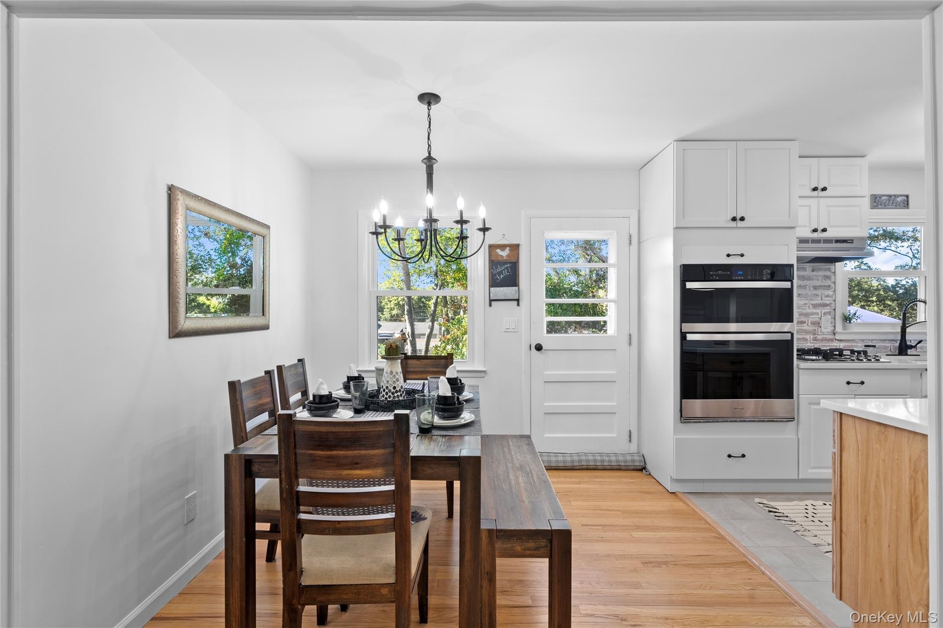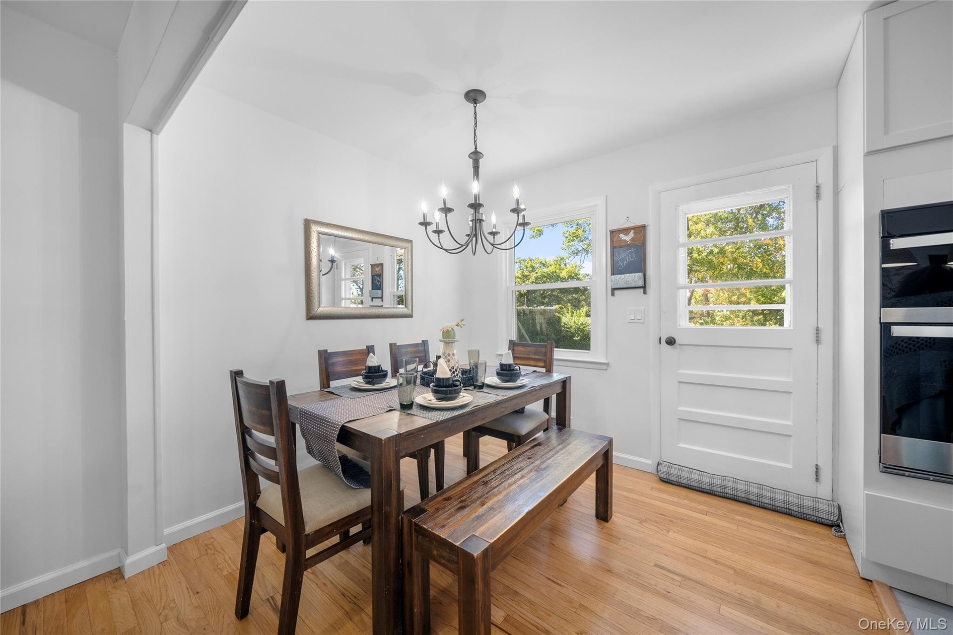 - Dining room with light wood-style floors and a chandelier
