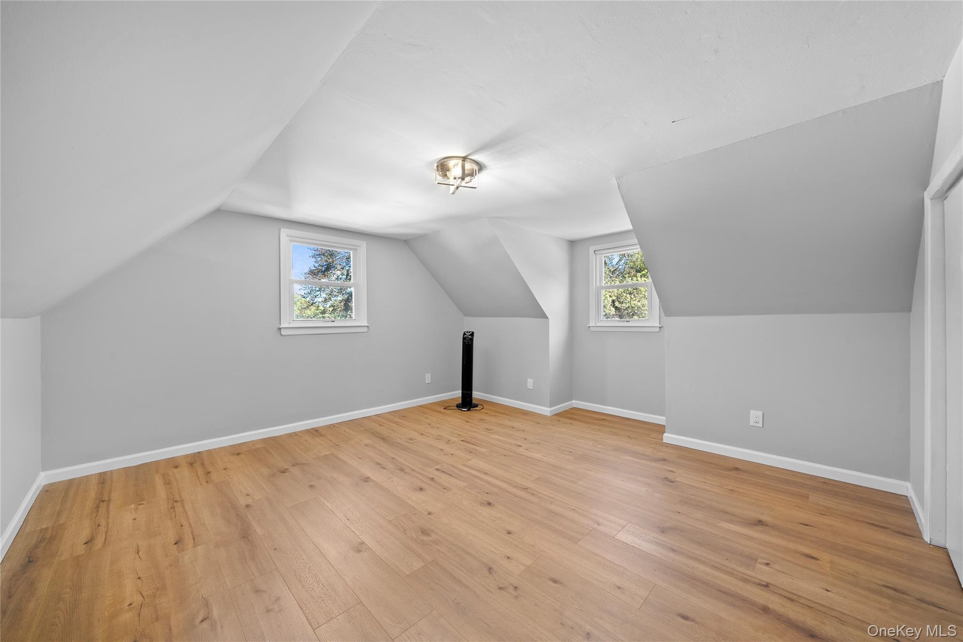 - Additional living space featuring vaulted ceiling and light wood-style flooring
