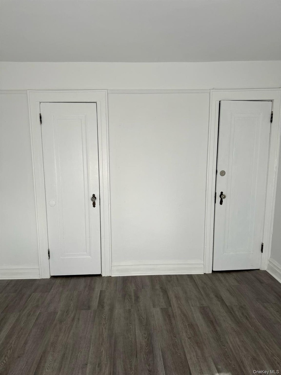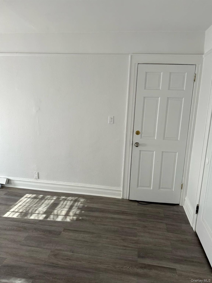 - Empty room featuring dark wood finished floors and baseboards