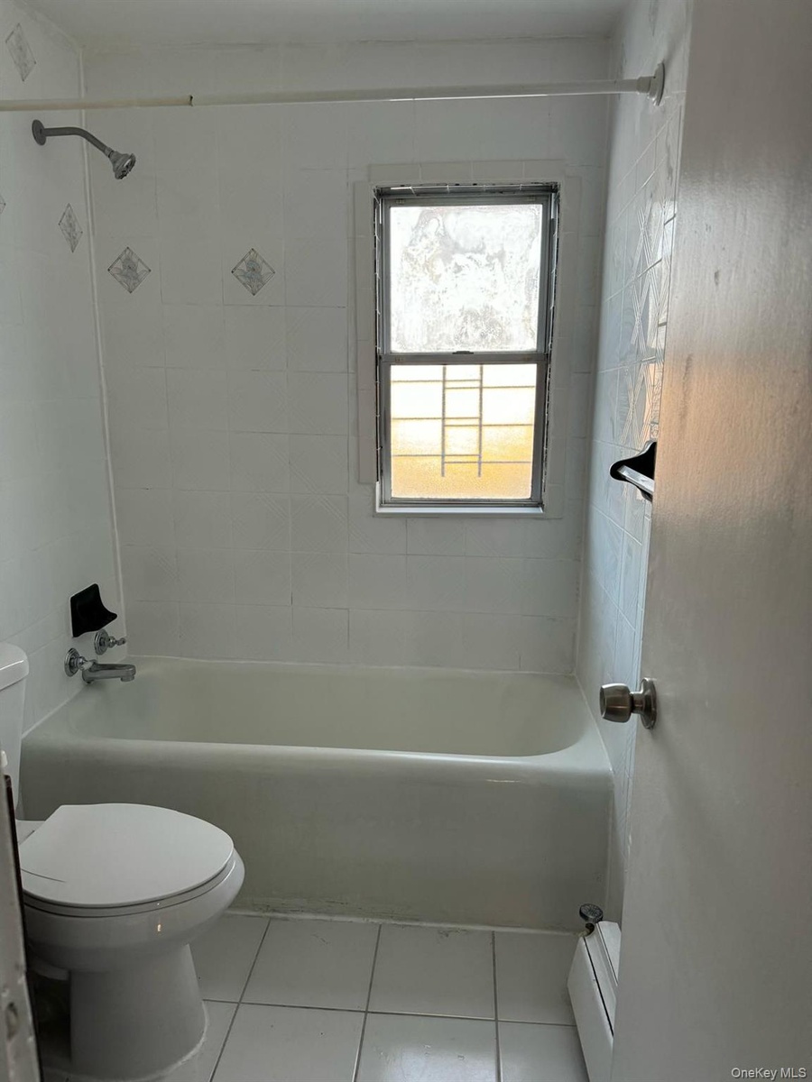 - Full bath with tub / shower combination, light tile patterned floors, a baseboard radiator, and vanity