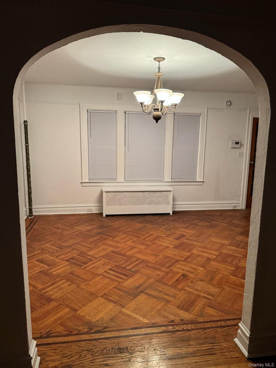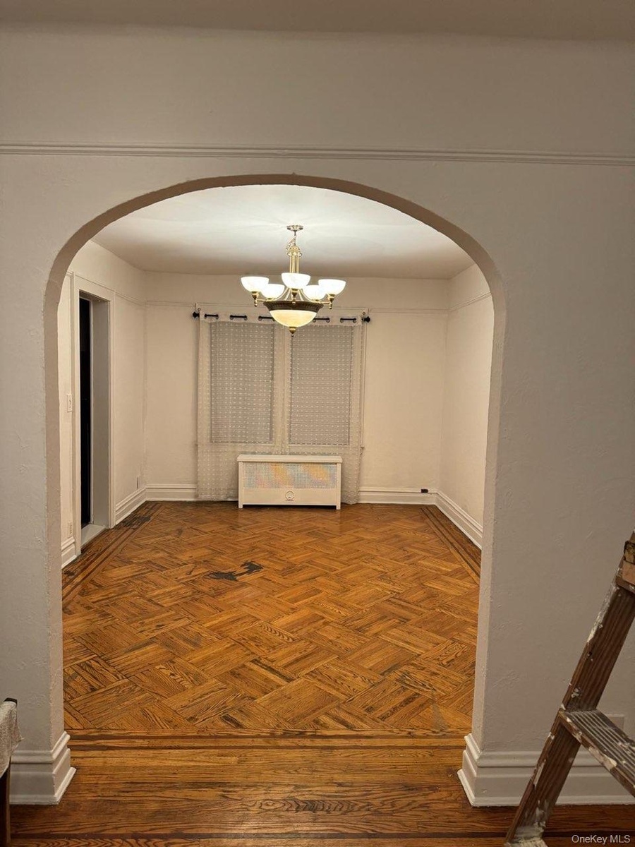 - Hall featuring arched walkways, radiator heating unit, and a chandelier