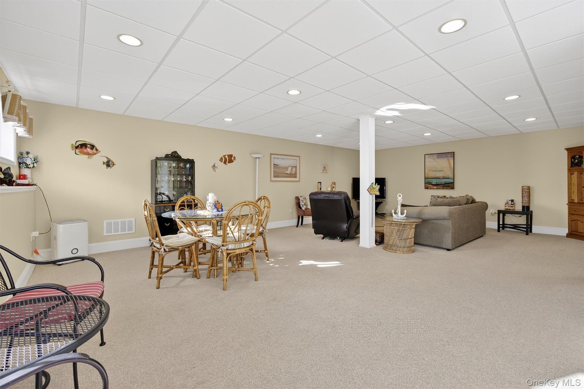- Dining area featuring light colored carpet, a drop ceiling, and recessed lighting
