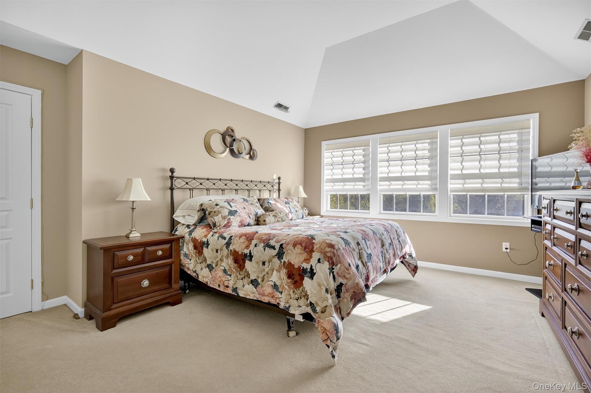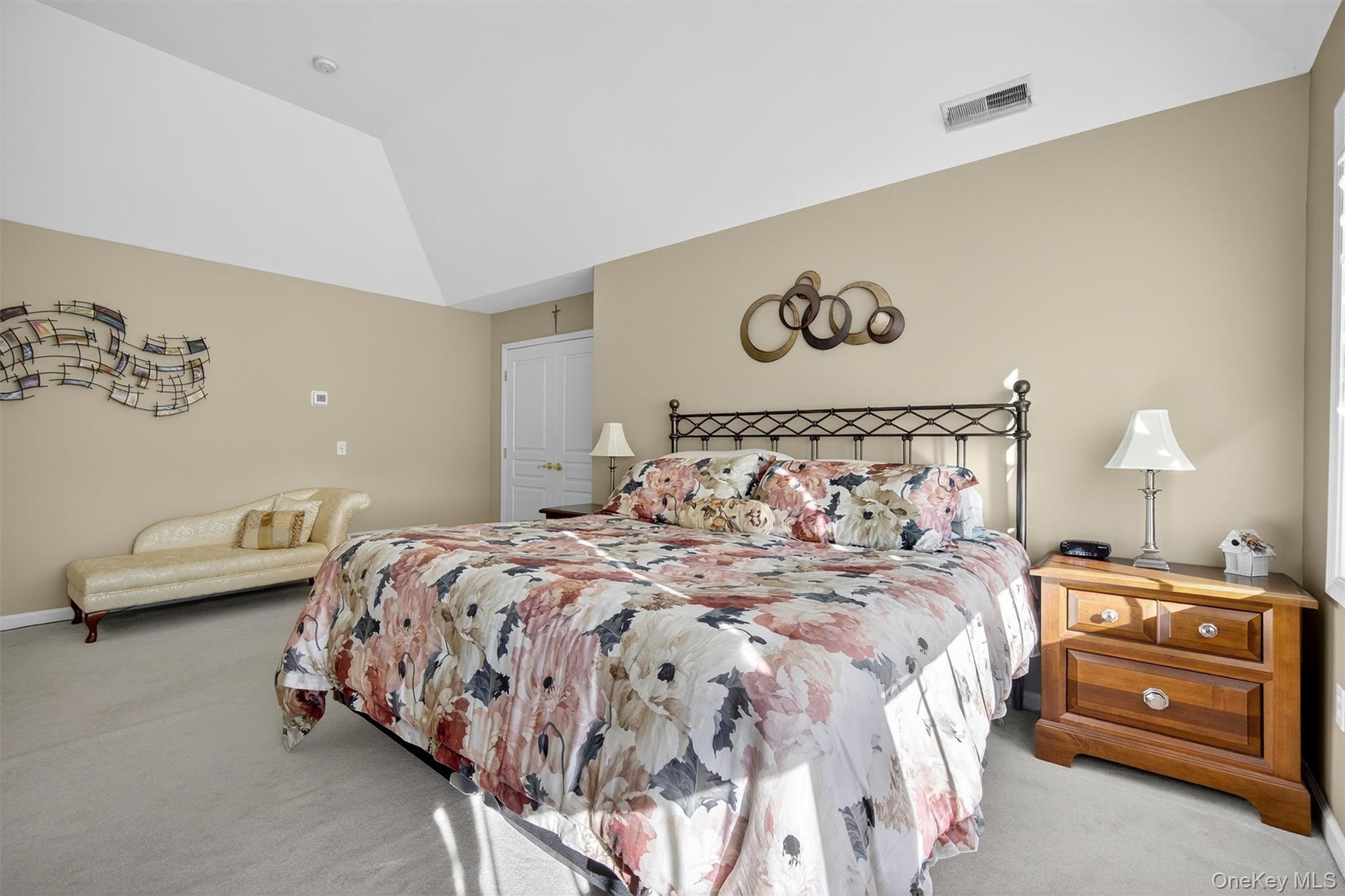 - Bedroom with light colored carpet and vaulted ceiling