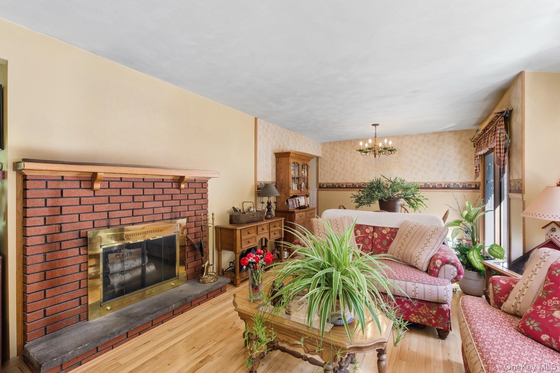 - Living room with wood finished floors, a brick fireplace, wallpapered walls, and a chandelier