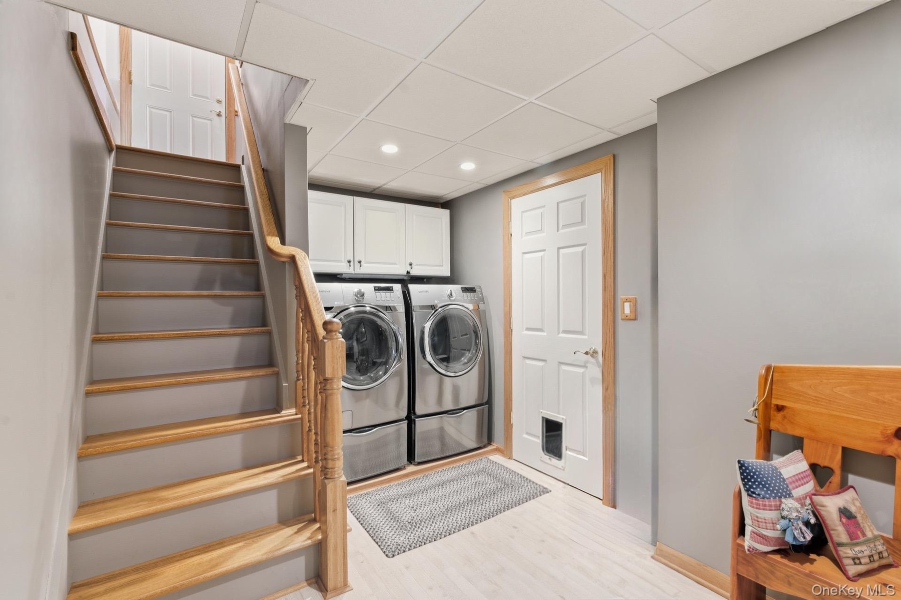 - Laundry room with a drop ceiling, light wood-style flooring, recessed lighting, washer and dryer, and cabinet space