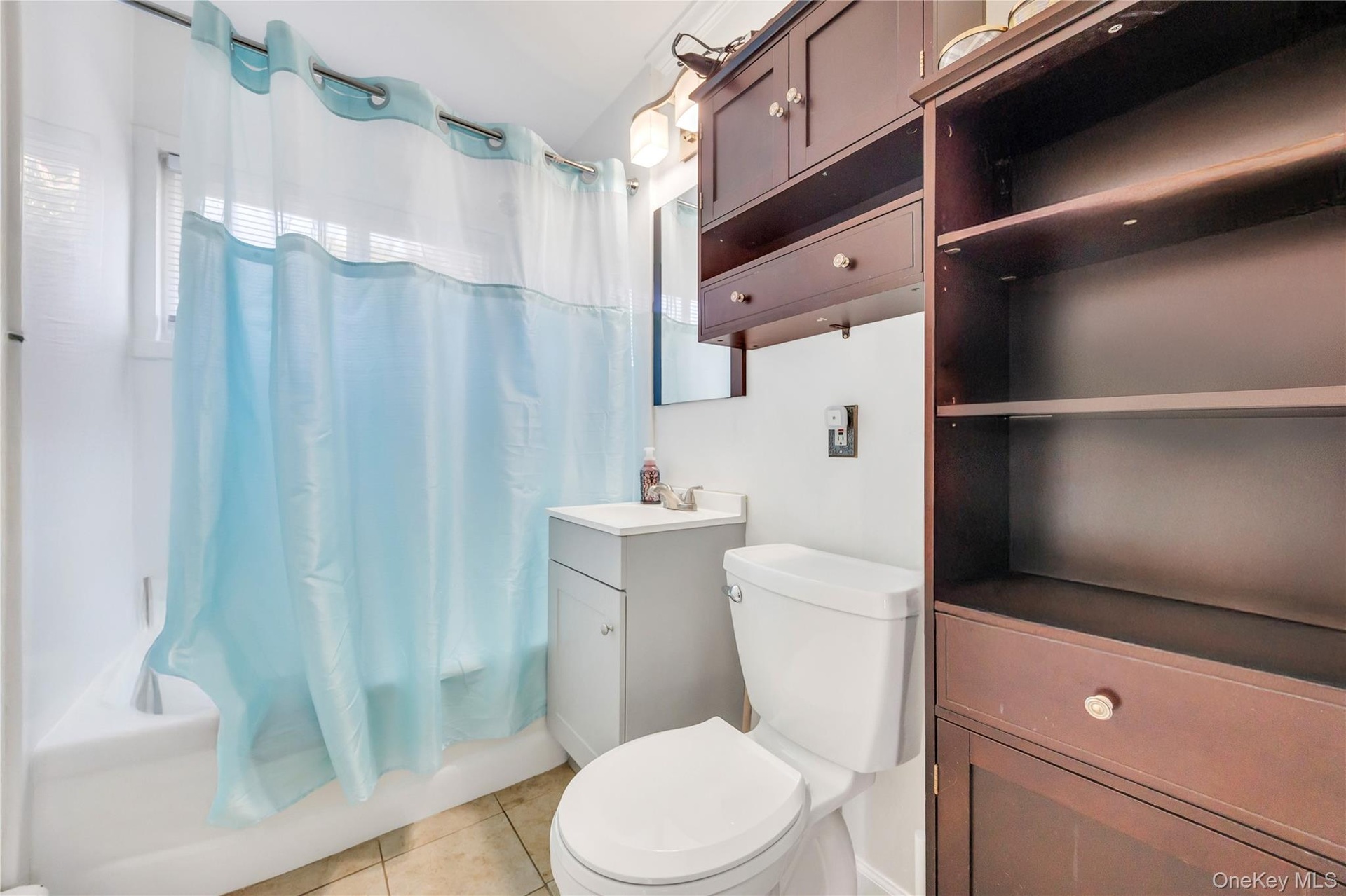 - Bathroom with light tile patterned flooring, vanity, and shower / tub combo with curtain