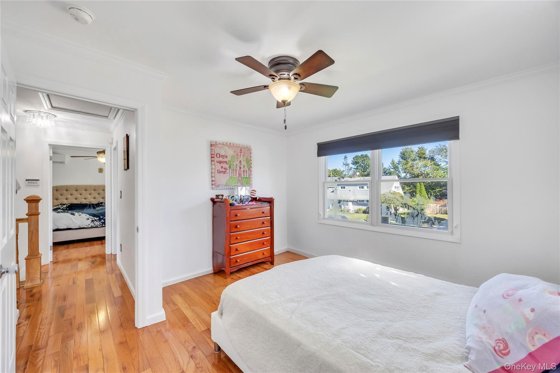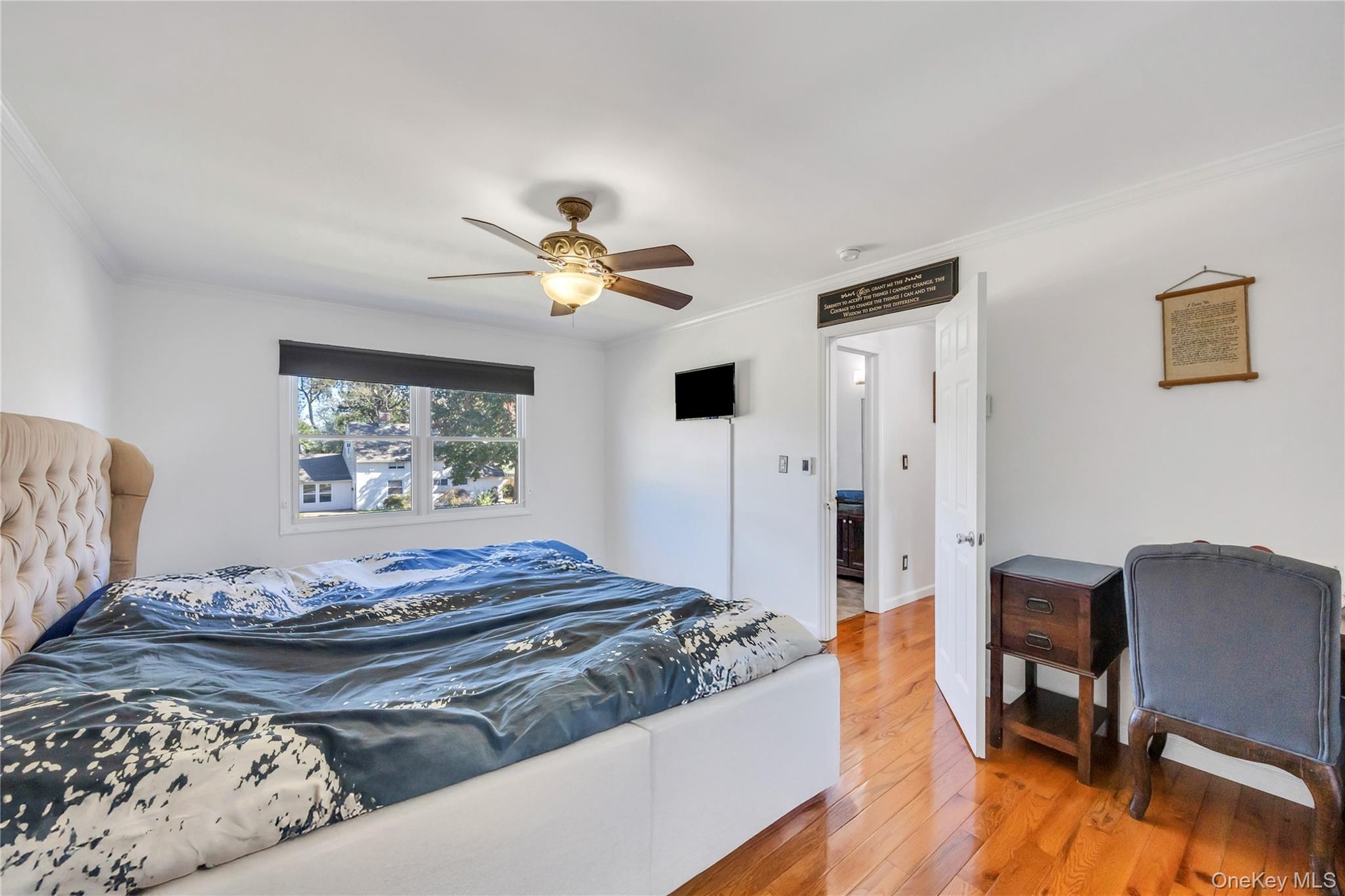 - Bedroom with wood-type flooring, crown molding, and ceiling fan