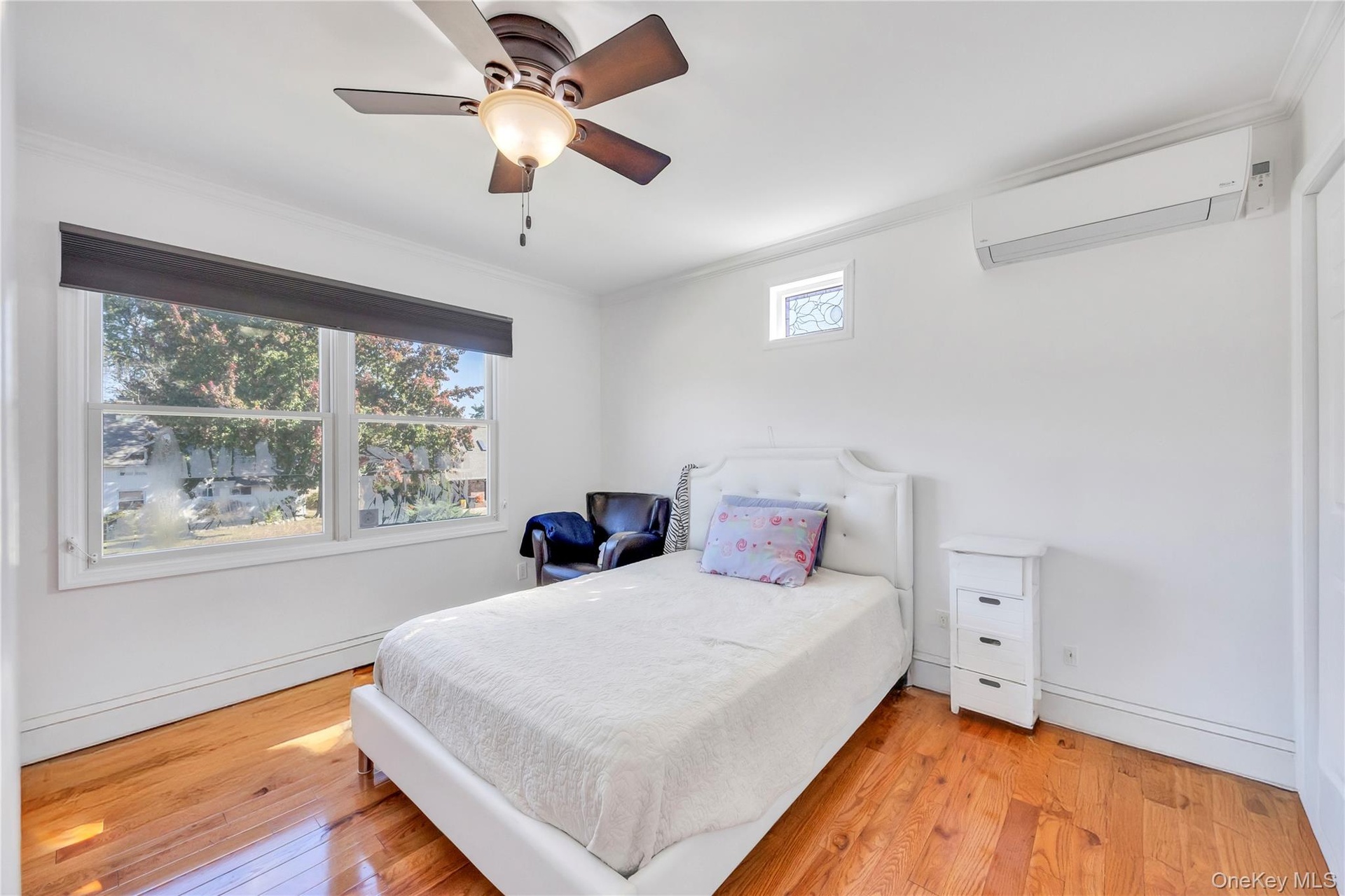 - Bedroom with baseboard heating, crown molding, wood tiled floors, ceiling fan, and a wall mounted air conditioner