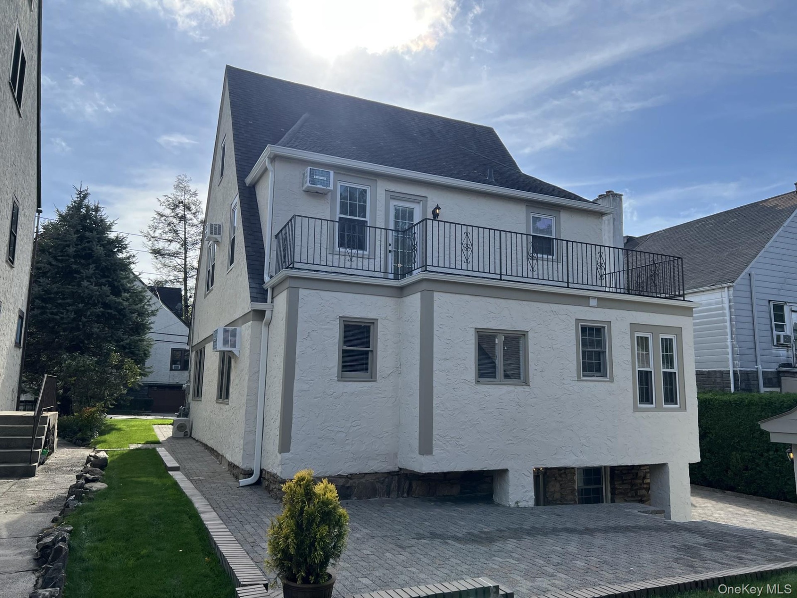 - Rear view of house, terrace off the primary bedroom, also steps to basement door
