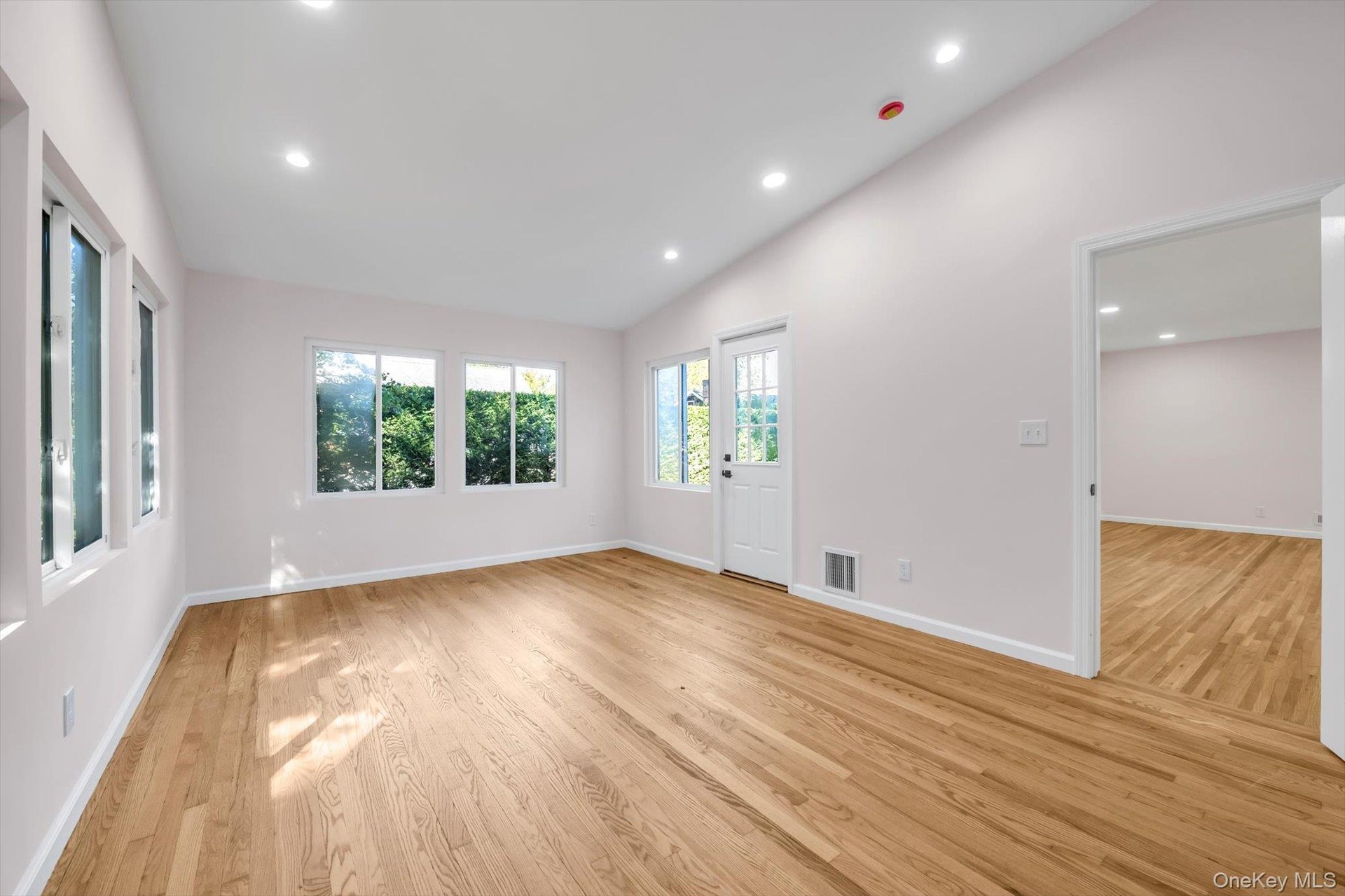 - Family Room with vaulted ceiling, recessed lighting, and light woo flooring