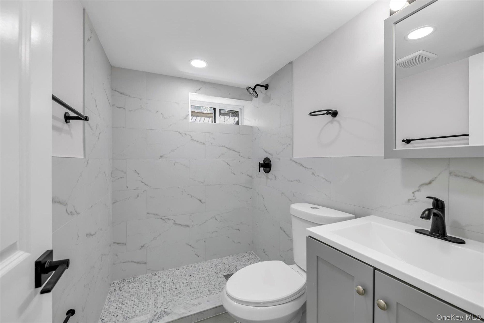 - Bathroom with vanity, a marble finish shower, recessed lighting, tile walls, and tasteful backsplash