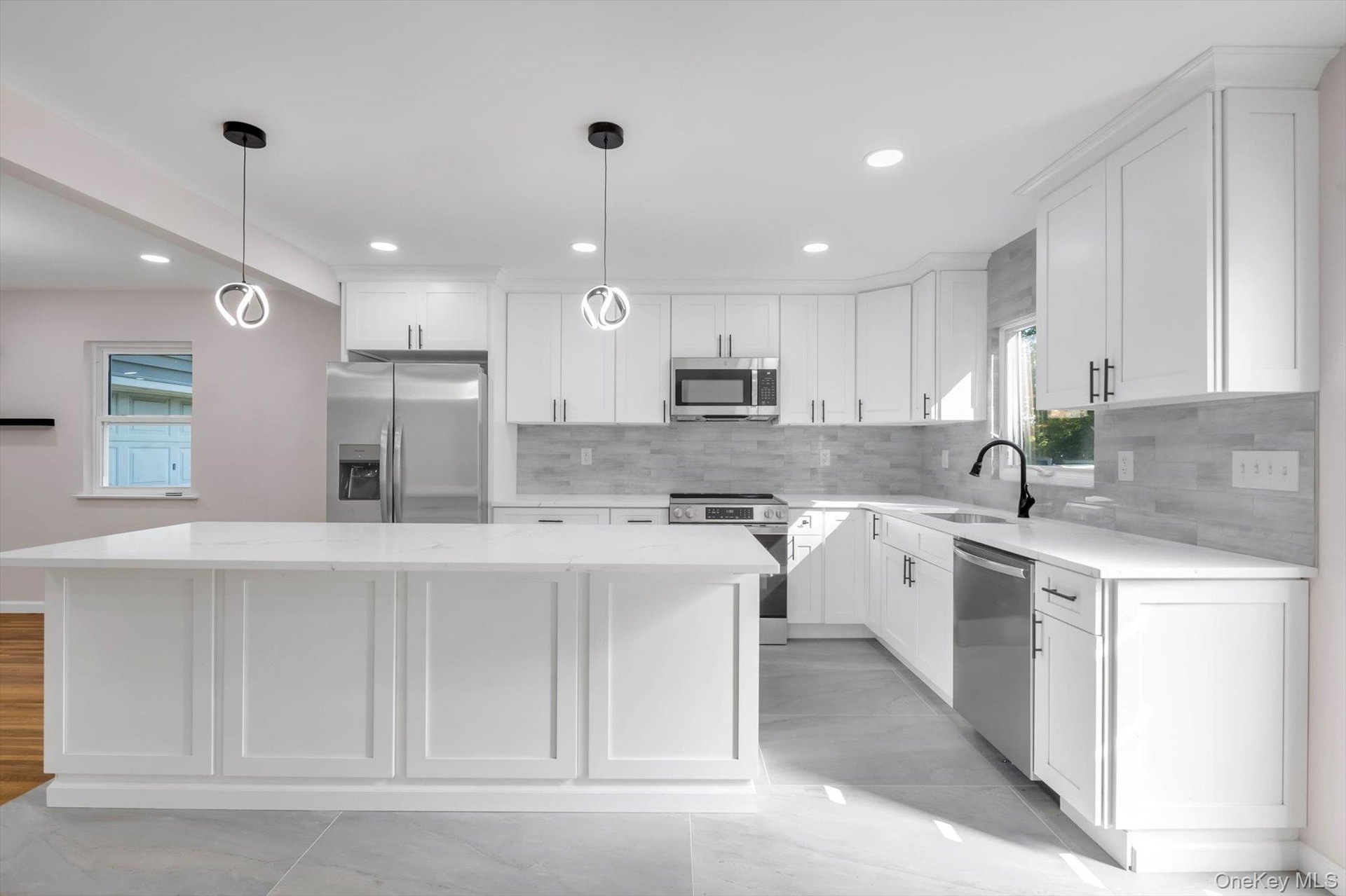 - Kitchen with appliances with stainless steel finishes, white cabinets, pendant lighting, decorative backsplash, and a kitchen island