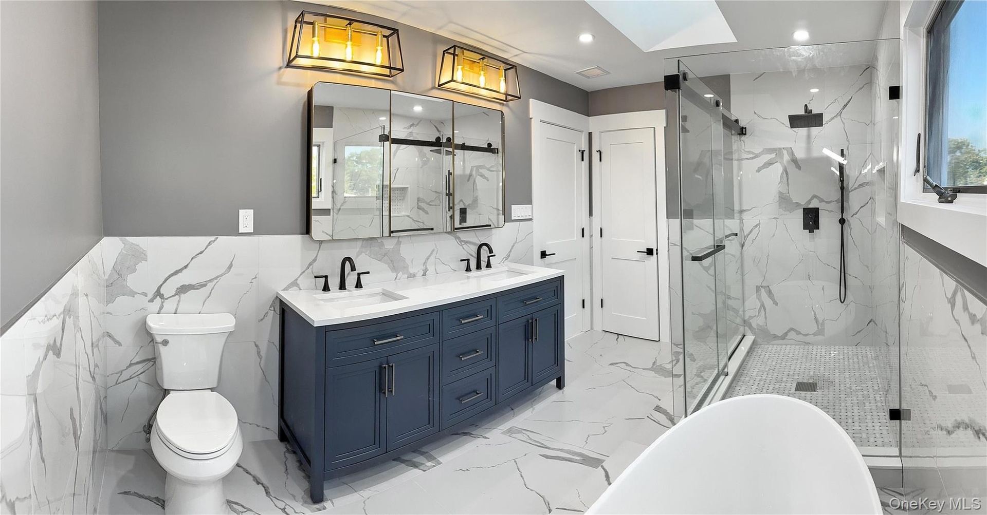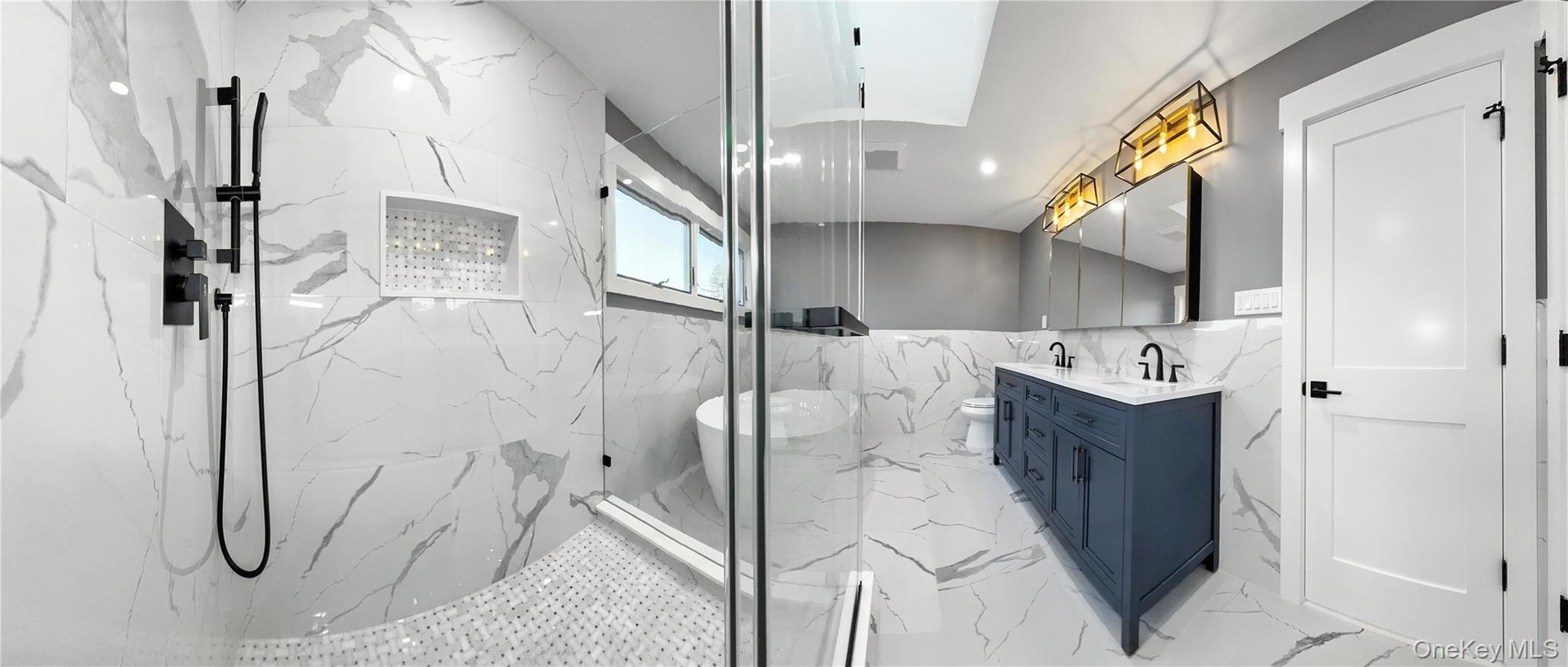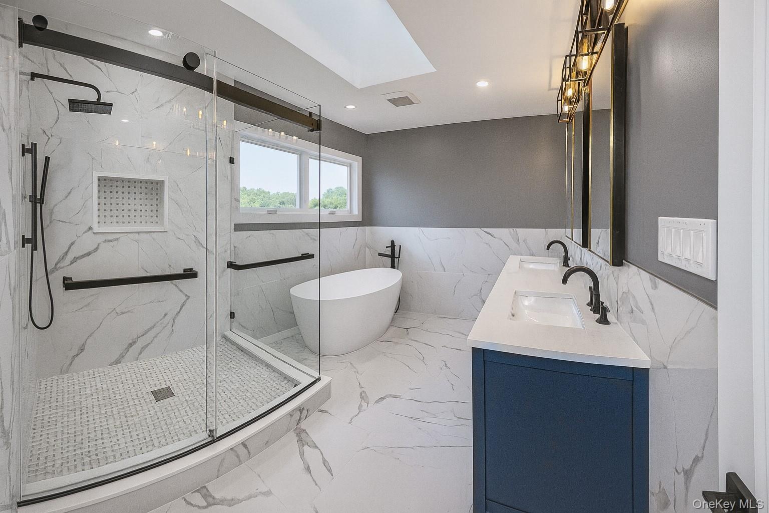 - Bathroom with marble finish flooring, a freestanding bath, double vanity, a marble finish shower, and tile walls