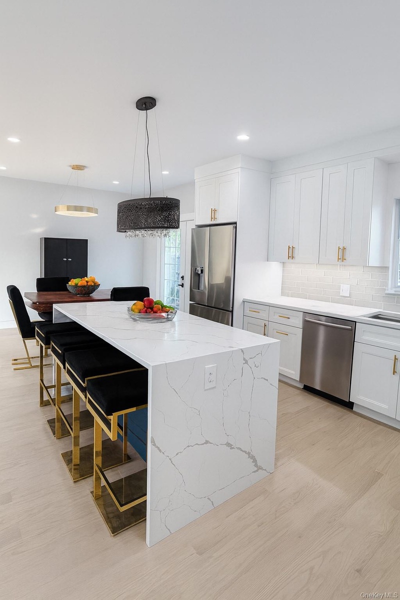 - Kitchen featuring a kitchen island, light wood-style floors, stainless steel appliances, light stone counters, and white cabinetry
