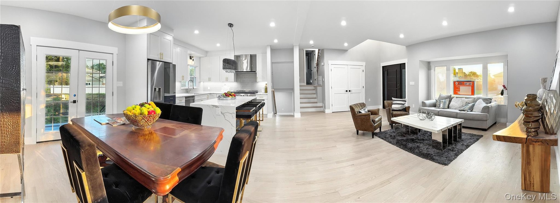 - Dining room featuring light wood-type flooring, recessed lighting, stairs, and french doors