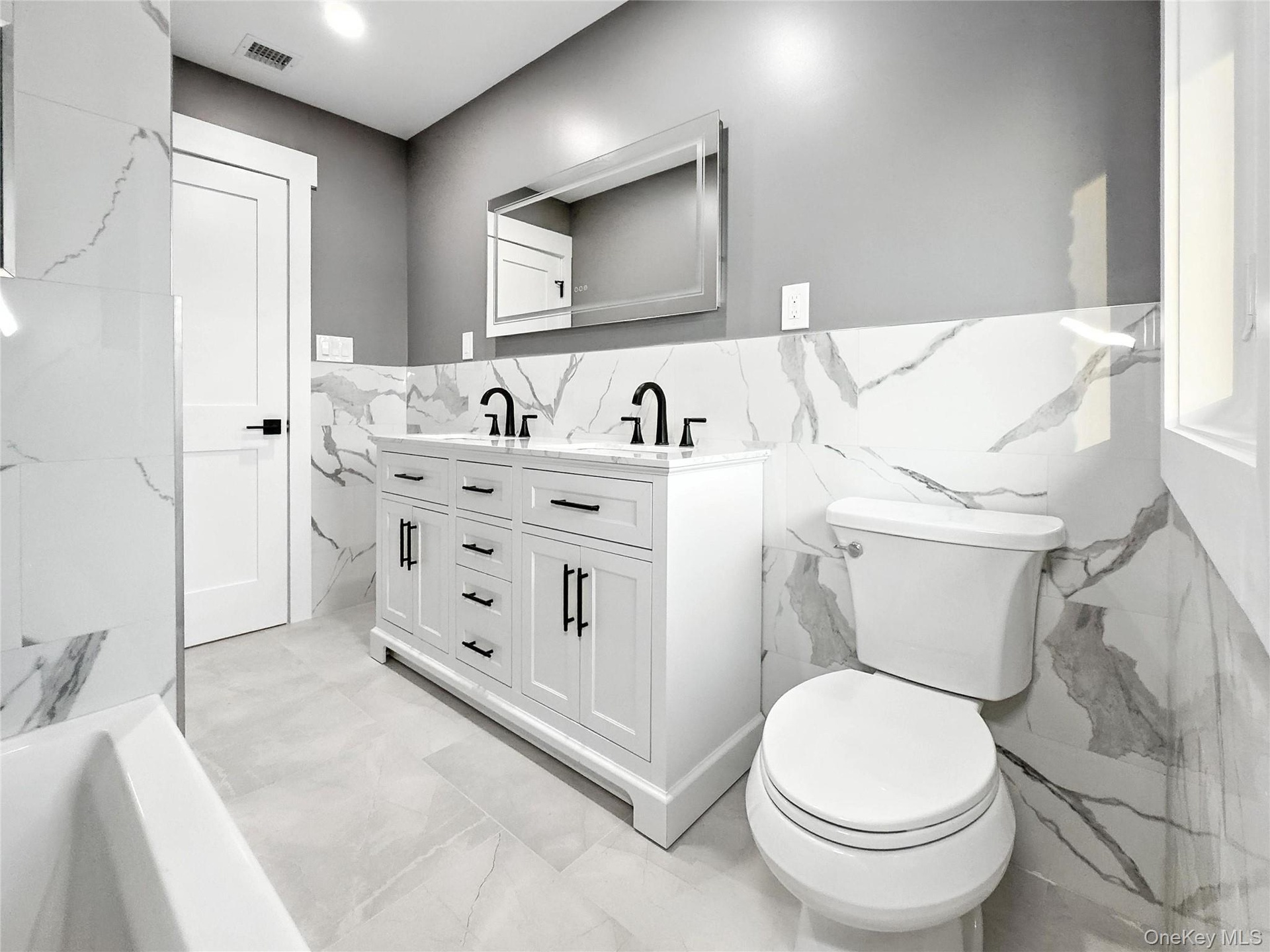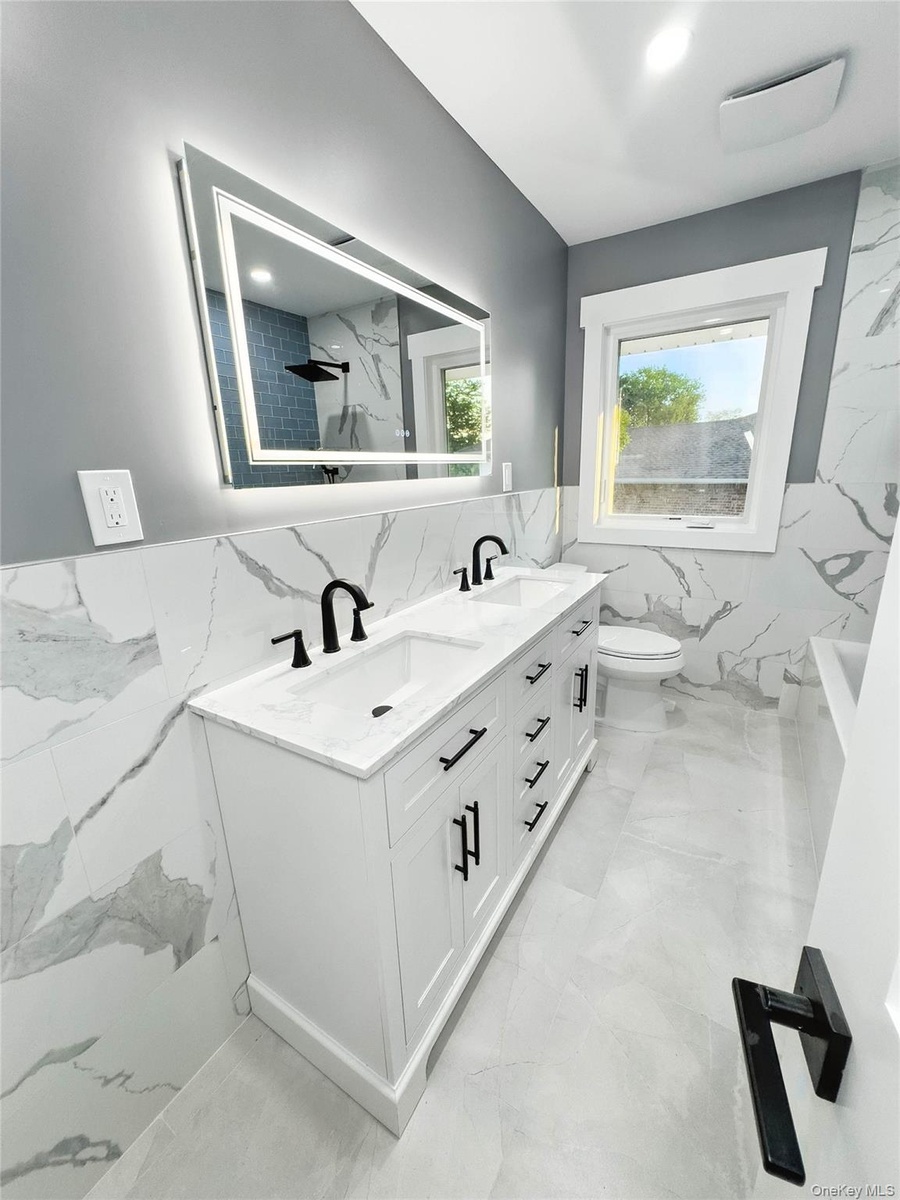 - Full bathroom with tile walls, a wainscoted wall, double vanity, marble look tile flooring, and a bathtub