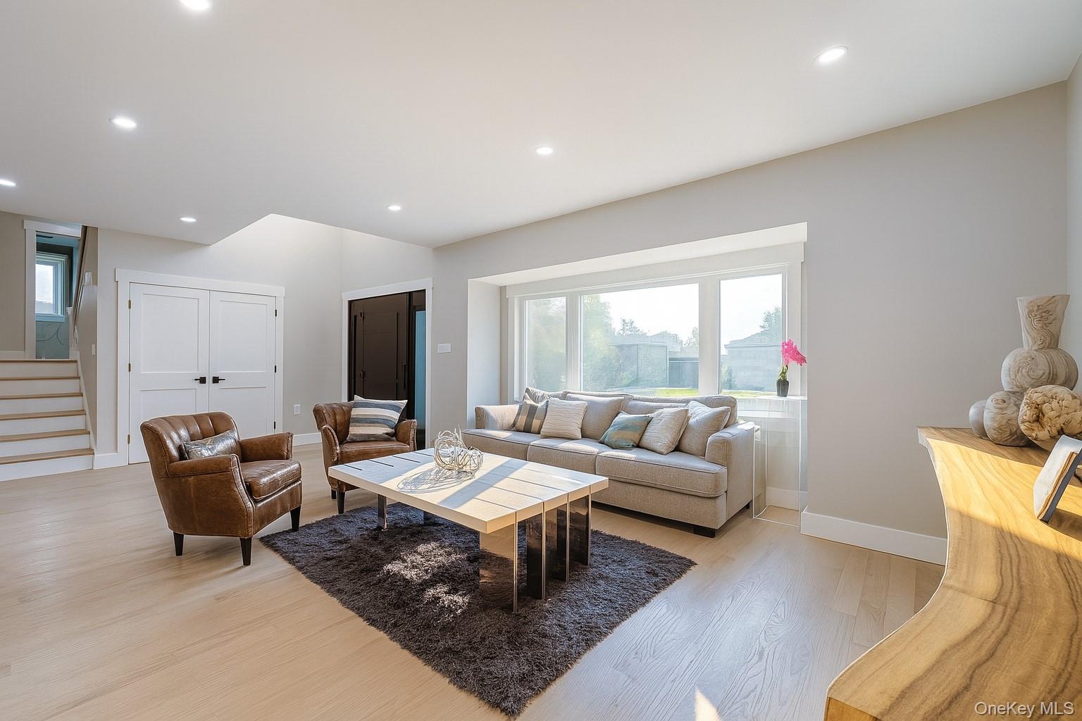 - Living area featuring light wood finished floors, stairs, and recessed lighting