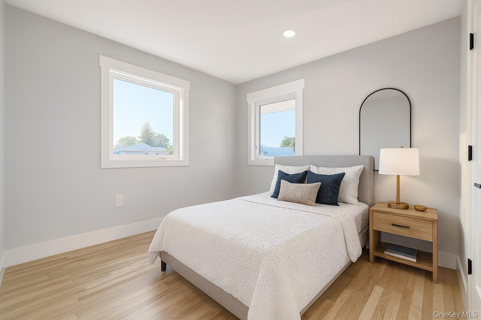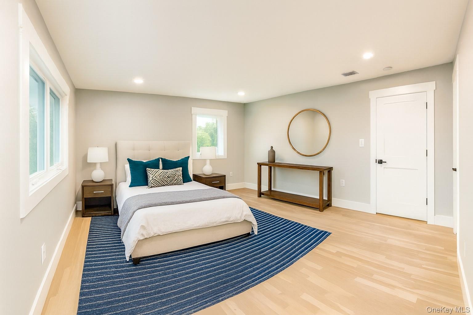 - Bedroom featuring light wood-style floors, recessed lighting, and a closet