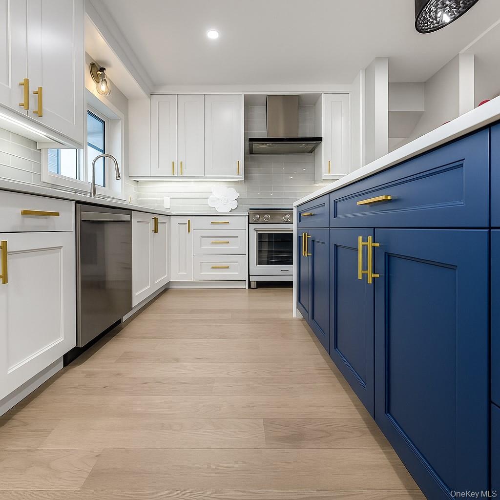 - Kitchen featuring white cabinetry, decorative backsplash, wall chimney exhaust hood, and blue cabinetry