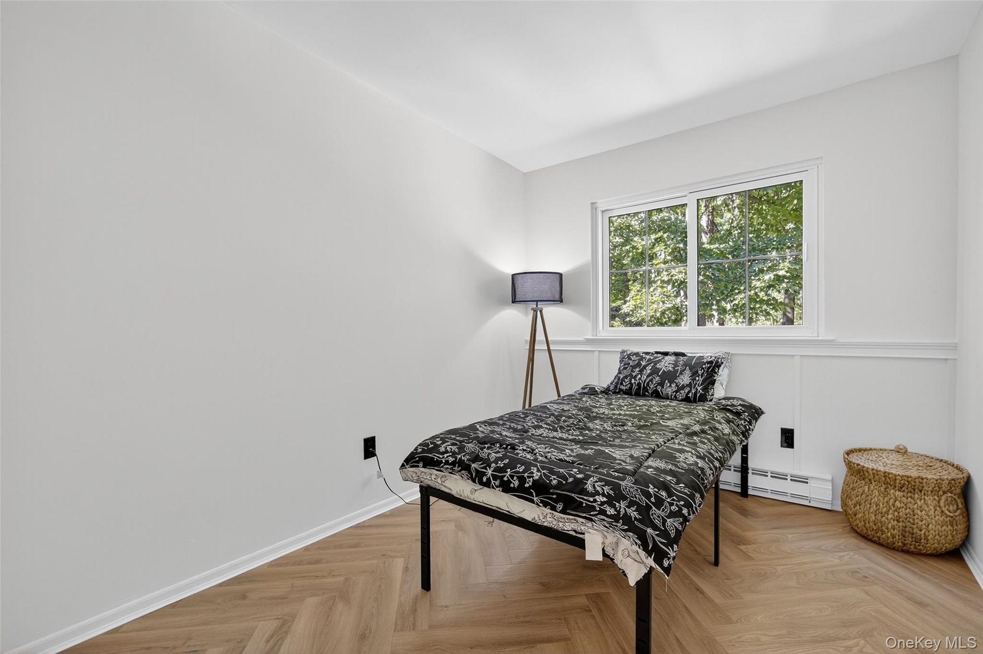 - Unfurnished dining area with a baseboard heating unit and baseboards