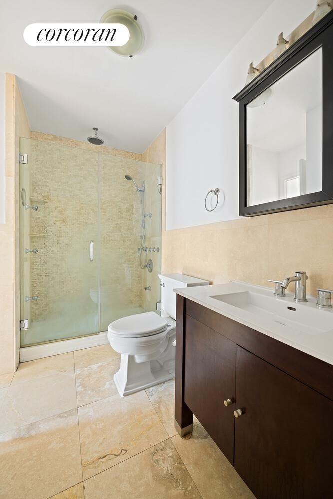 The current layout features a garden duplex with a large open chef's kitchen appointed with granite countertops, top-of-the-line appliances including a dishwasher, and even a built-in espresso machine. The spacious bedroom offers beautiful built-ins and generous closet space, and the primary bathroom features a walk-in steam shower.