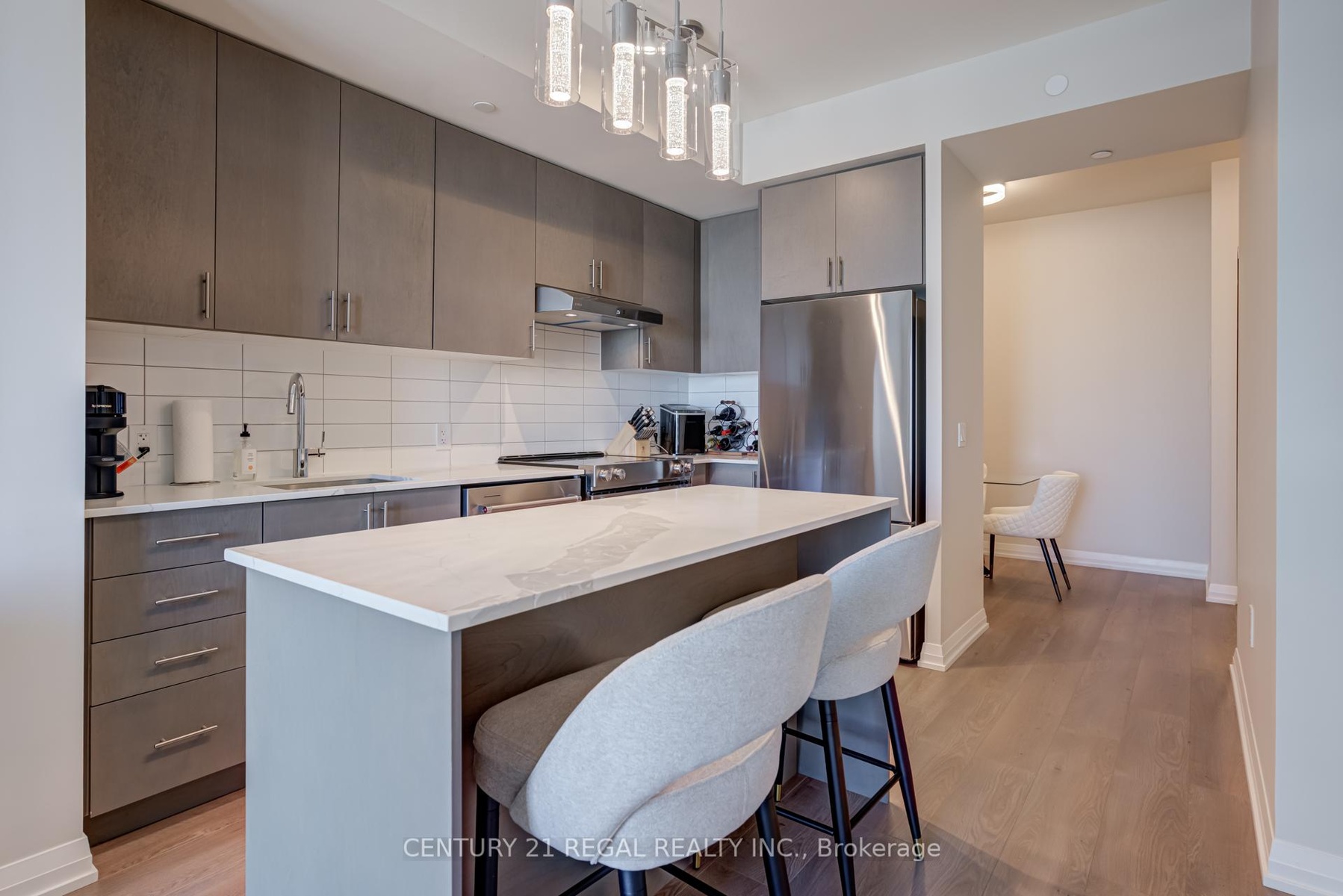 Discover modern living in this stylish 1 Bedroom + 1 Den, 2-Bathroom condo in the highly sought after Charisma Tower in Vaughan. This suite boasts 9 ft ceilings, floor-to-ceiling windows, and a versatile den. The kitchen features quartz countertops, stainless steel appliances, extended cabinets. Upgraded light fixtures, wall-mounted fireplace, zebra blinds. The primary bedroom offers a 4-piece ensuite and double closet. Exceptional amenities include an outdoor pool and terrace, fitness club and yoga studio, pet grooming salon, serenity lounge, bocce court, and 24/7 concierge service. Located steps from Vaughan Mills, Hwy 400, public transit and top restaurants.