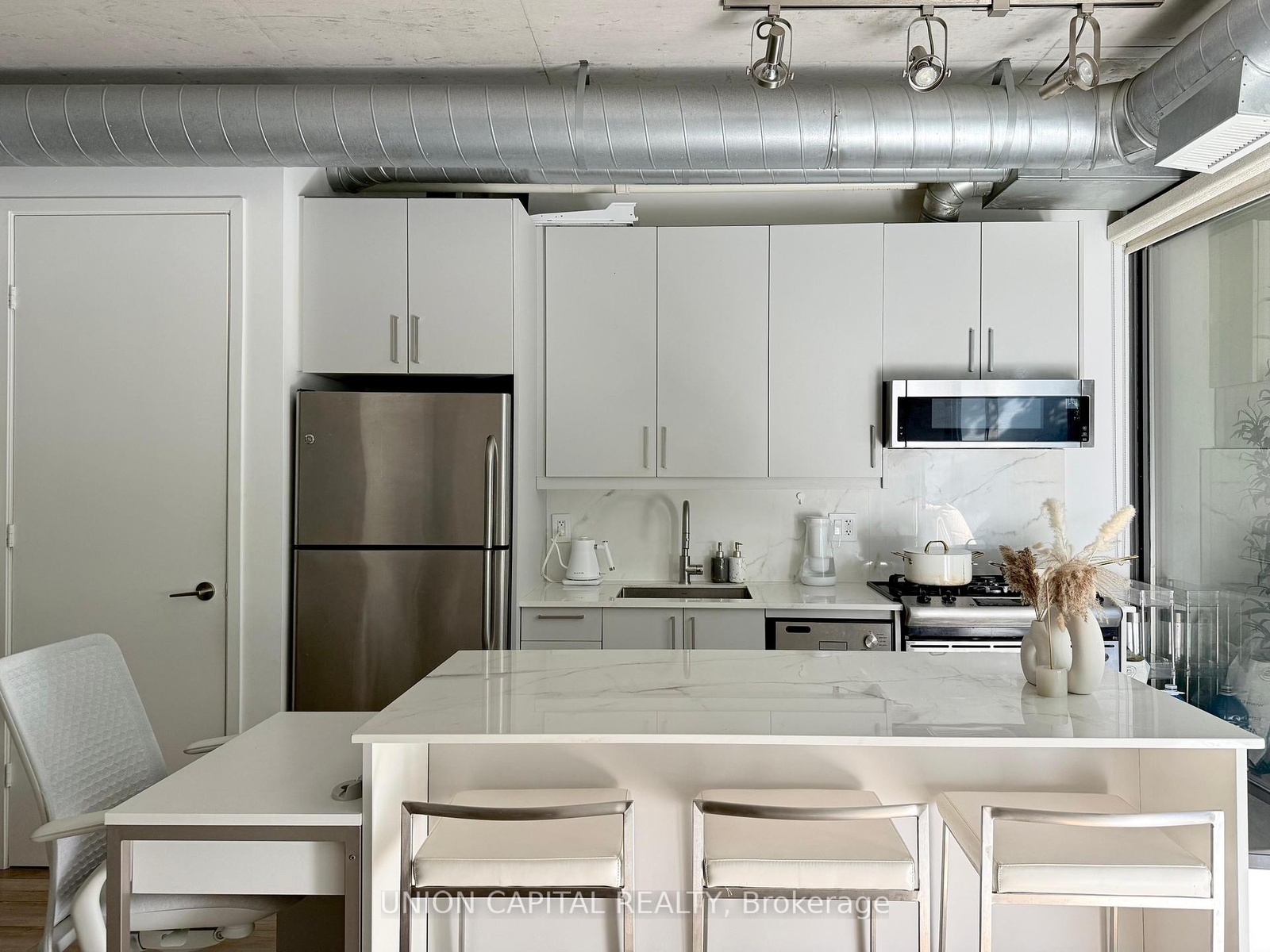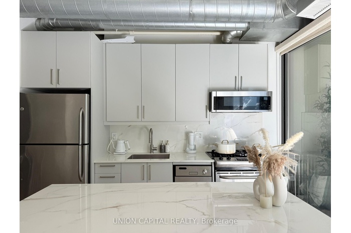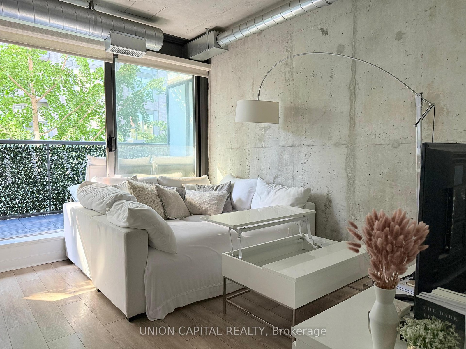 FULLY FURNISHED | Just pack your bags and enjoy this bright and stylish 1-bedroom loft that perfectly captures the best of downtown living in one of Toronto's most vibrant neighbourhoods. Step inside to discover exposed concrete ceilings and feature walls, industrial-style ductwork, and floor-to-ceiling windows that fill the space with natural light. Oversized double patio doors create a seamless connection to your spacious private terrace ideal for entertaining or relaxing. With a natural gas BBQ hookup and water connection, the terrace truly feels like an outdoor extension of your living space. Inside, you'll find gas cooking, built-in closet organizers, and an open-concept layout. Tucked away in a quiet boutique building just off Queen West, you're steps from Loblaws, Joe Fresh, Winners, LCBO, Waterworks, The Well and an endless selection of cafes, restaurants, and nightlife. Enjoy weekend strolls to Trinity Bellwood's Park, or explore nearby Ossington and King West. With a 100 Walk Score, 100 Transit Score, and 99 Bike Score, convenience truly doesn't get better than this.