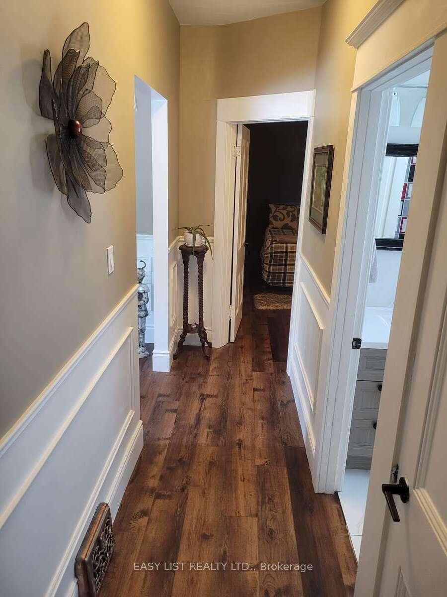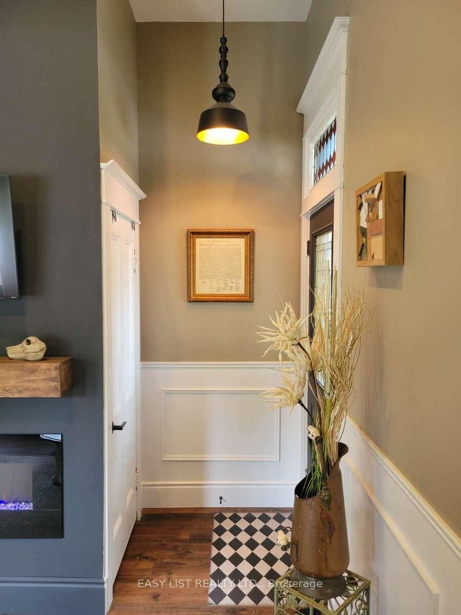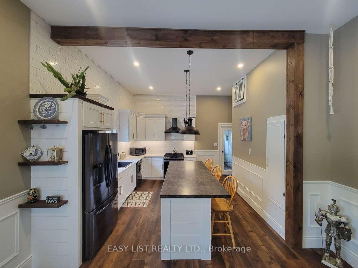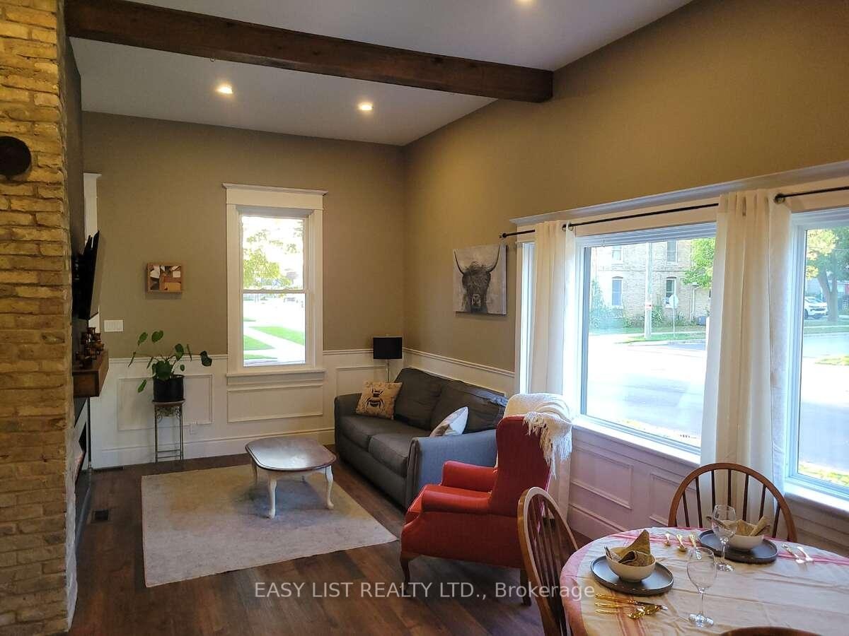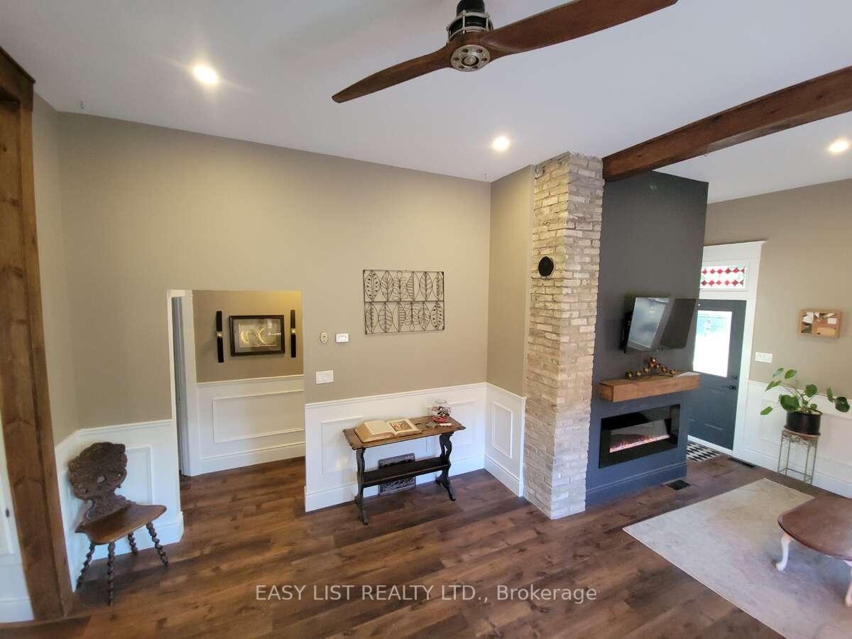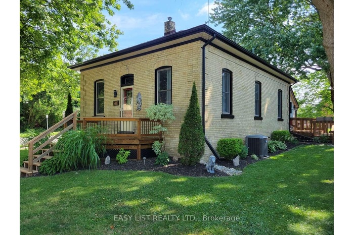 DescriptionFor more info on this property, please click the Brochure button. Beautifully renovated yellow-brick bungalow on a corner lot in the heart of town - just a short walk to the grocery store, LCBO, banks, and the downtown core. At the end of the street you'll find the arena, sports fields, tennis court, elementary and high schools, a skate park, and walking trails. The property is framed by six mature trees for shade and privacy, with perimeter gardens finished in black chip and a 7'8' steel garden shed. A freshly re-sealed deck extends your living space outdoors, offering plenty of room for dining and lounging. Inside, the home was fully gutted in 2021 and professionally finished, marrying warm classic details with modern touches. High ceilings, wainscoting, wood beams, and an exposed chimney highlight the home's original charm, while all-new matching Samsung black stainless steel appliances - counter-depth fridge, gas range, and dishwasher - anchor the kitchen. Main-floor laundry adds convenience. Layout: 2+1 bedrooms, 2 full bathrooms, open living/dining/kitchen, and a functional mudroom. Beautiful home!Amenities- Brick & Beam