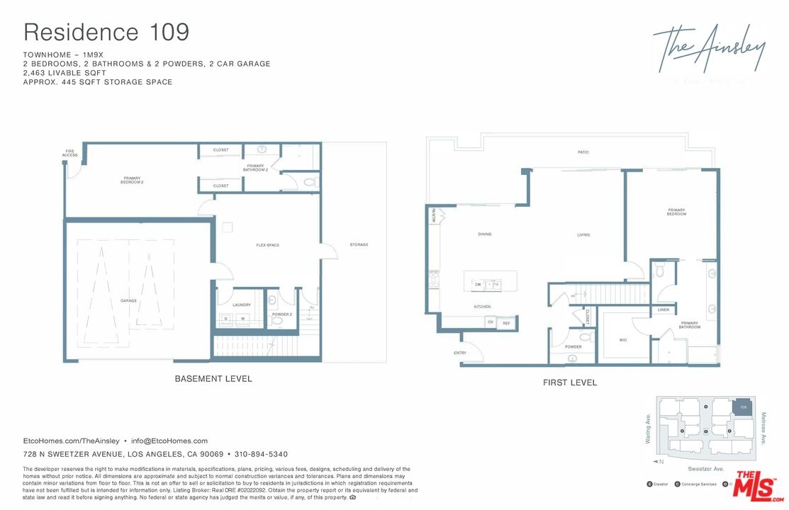 Discover a rare corner 2-story townhome offering 2,463 SF of thoughtfully designed living space and a 543 SF expansive patio. This home features 2 bedrooms, 2 full baths, 2 powder rooms, a dedicated laundry room, and a versatile 445 SF flex space on the lower level. An oversized private 2-car garage with direct home access provides unmatched convenience. The main level boasts an expansive kitchen with island, crafted with Snaidero Italian cabinetry and premium Sub-Zero/Wolf appliances. The open-concept layout connects seamlessly to the dining and living areas, while a formal entry and spacious outdoor patio create a lifestyle beyond the standard condominium. Refined finishes include Caesarstone countertops, Italian Gessi plumbing fixtures, and Hydro Systems soaking tubs. Only two townhomes remain at The Ainsley, a boutique community nestled on a highly walkable, tree-lined street just steps from the best of Melrose. Residents enjoy exclusive amenities including concierge services, a private lounge, fitness center, yoga and training rooms, and more.