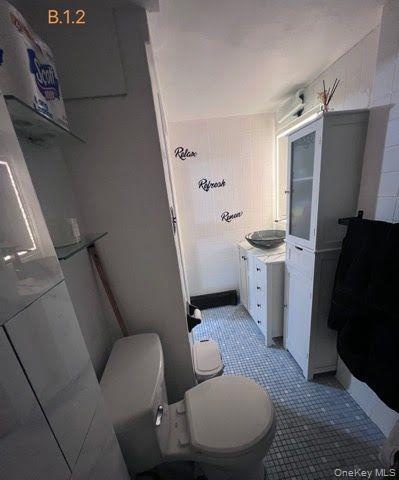 - Full bath featuring tile walls, vanity, tile patterned floors, and a shower with curtain