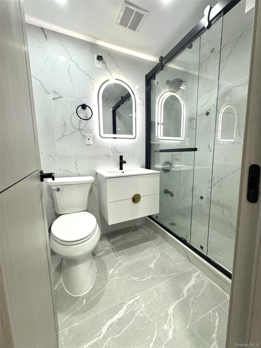 - Bathroom featuring marble tiled floors, tile walls, vanity, a marble finish shower, and stone wall